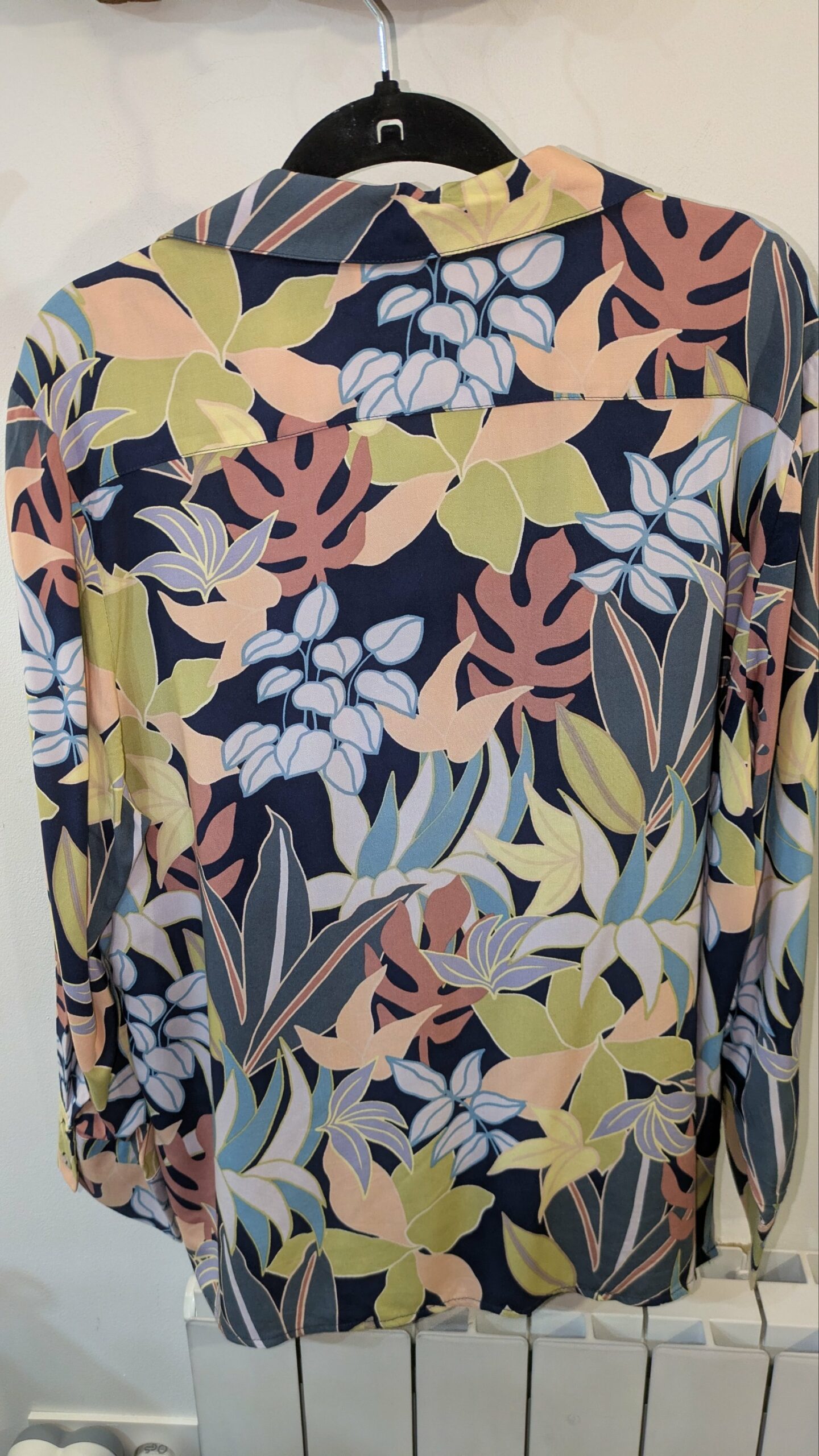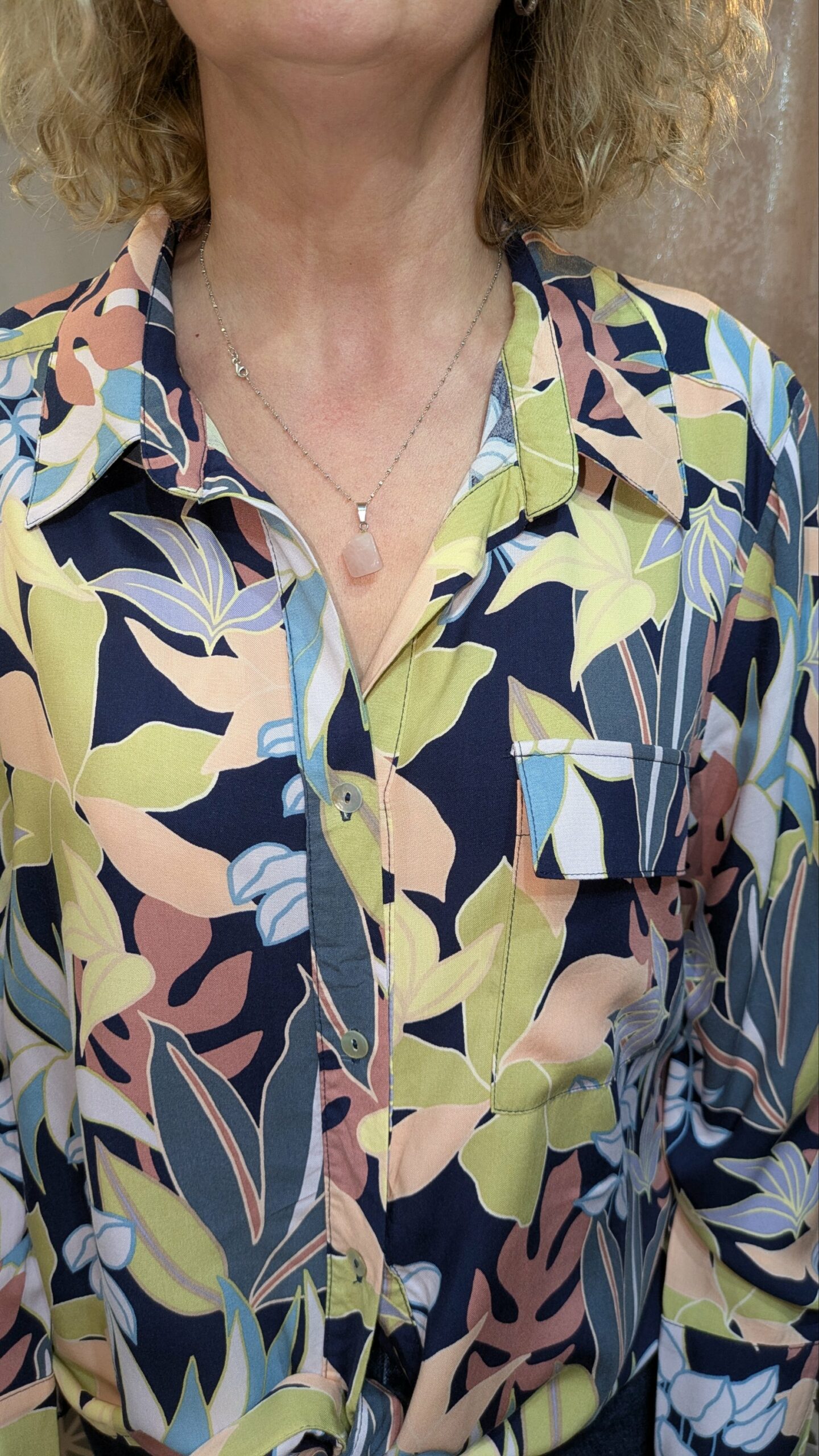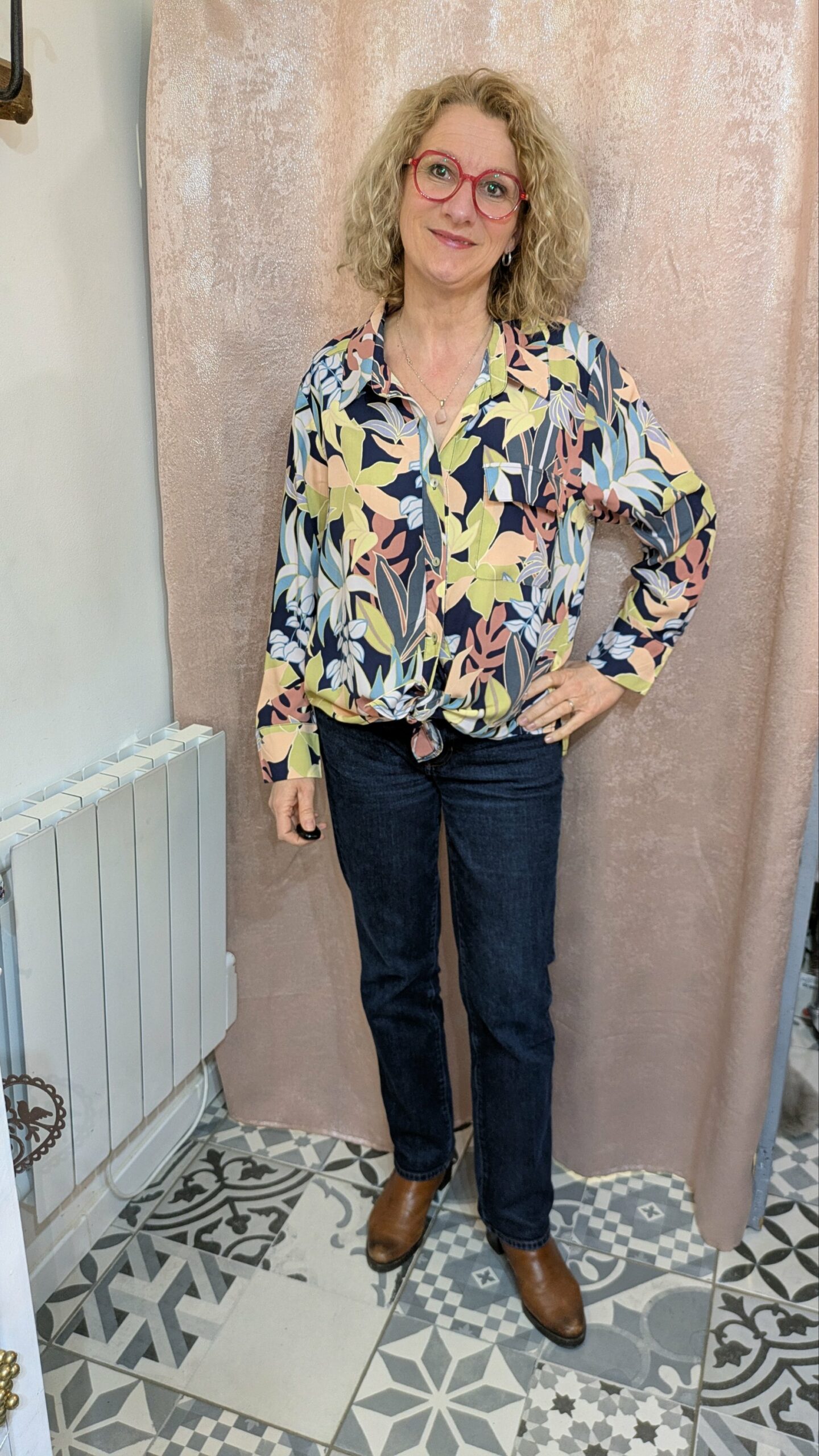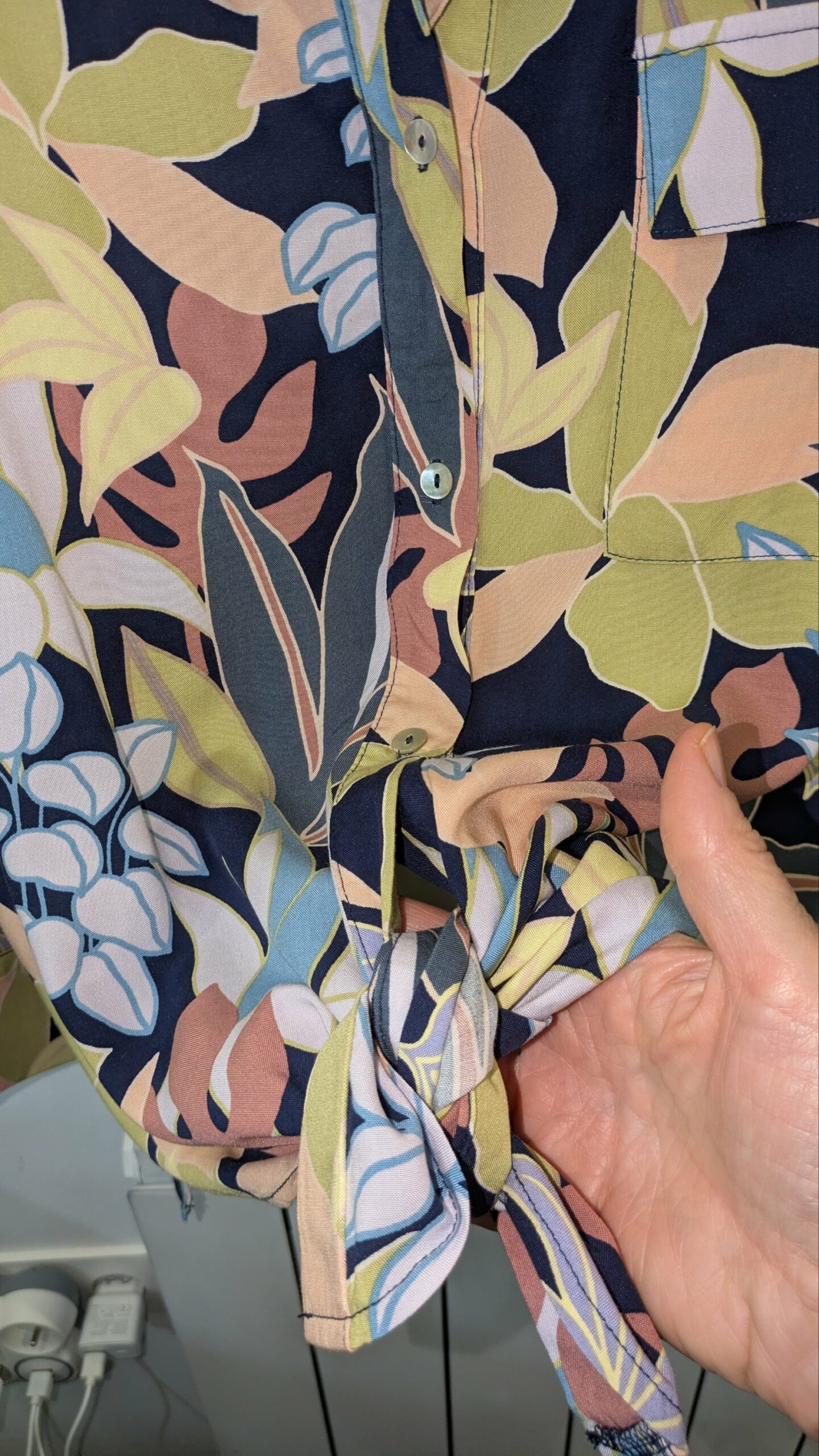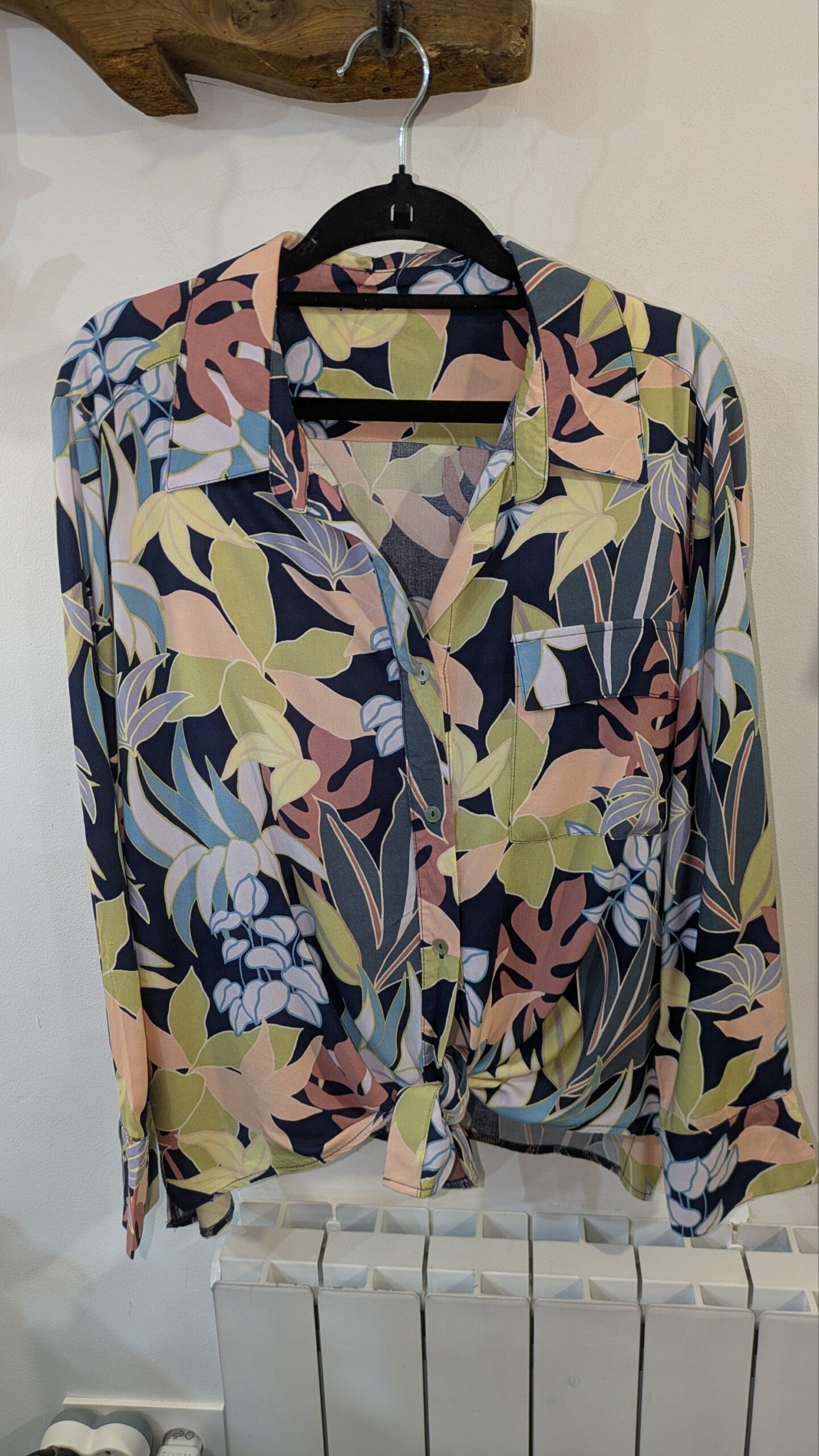 Cette chemise se distingue par son imprimé floral mêlant des nuances de vert, rose, bleu et beige sur un fond bleu nuit. Son style bohème et ses manches longues en font une pièce polyvalente, parfaite pour les journées douces ou les soirées décontractées. Le détail à nouer au bas permet d’ajuster la coupe et d’apporter une touche féminine et originale. Les boutons sur le devant et les poches discrètes ajoutent une note pratique et esthétique.