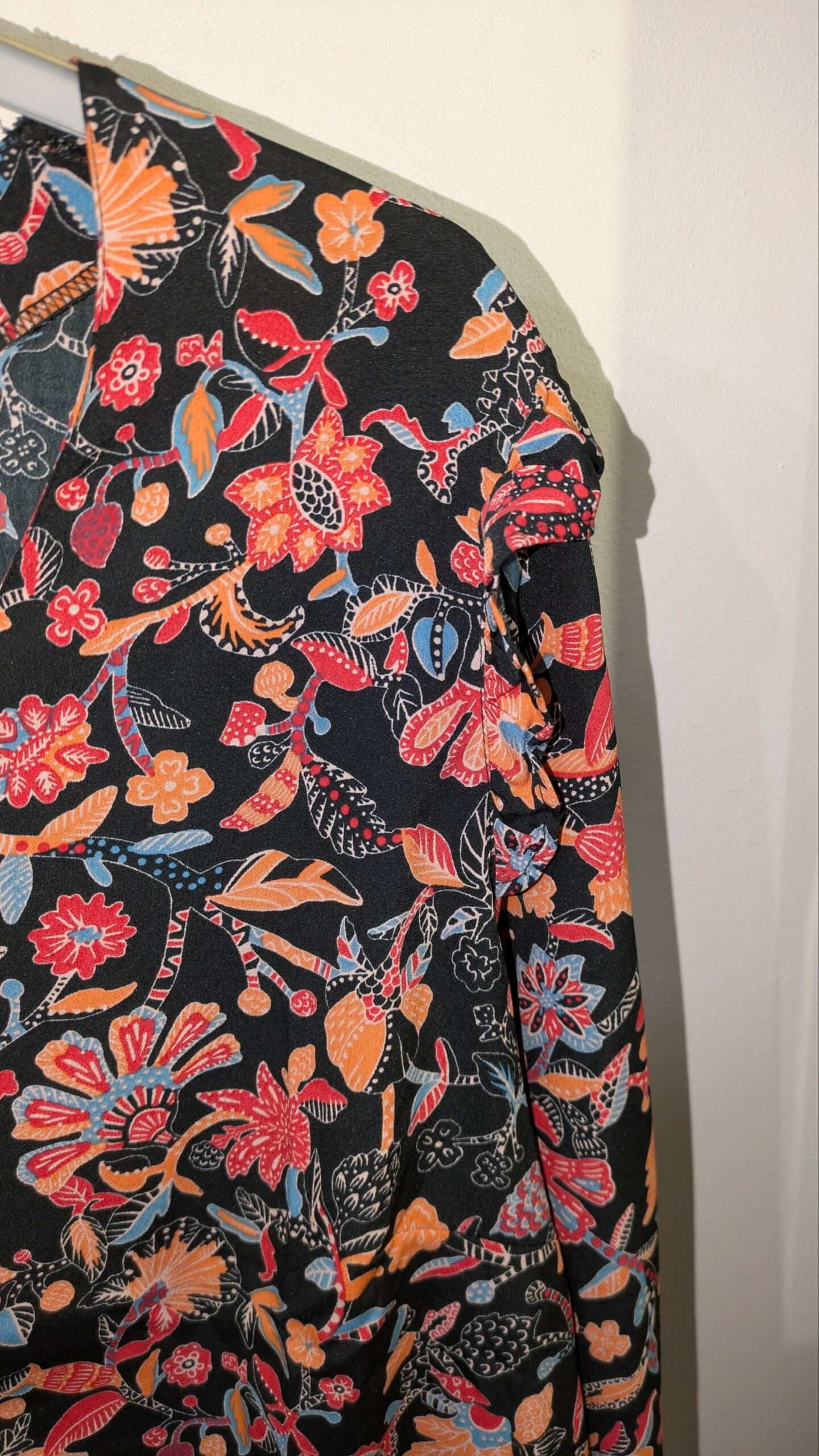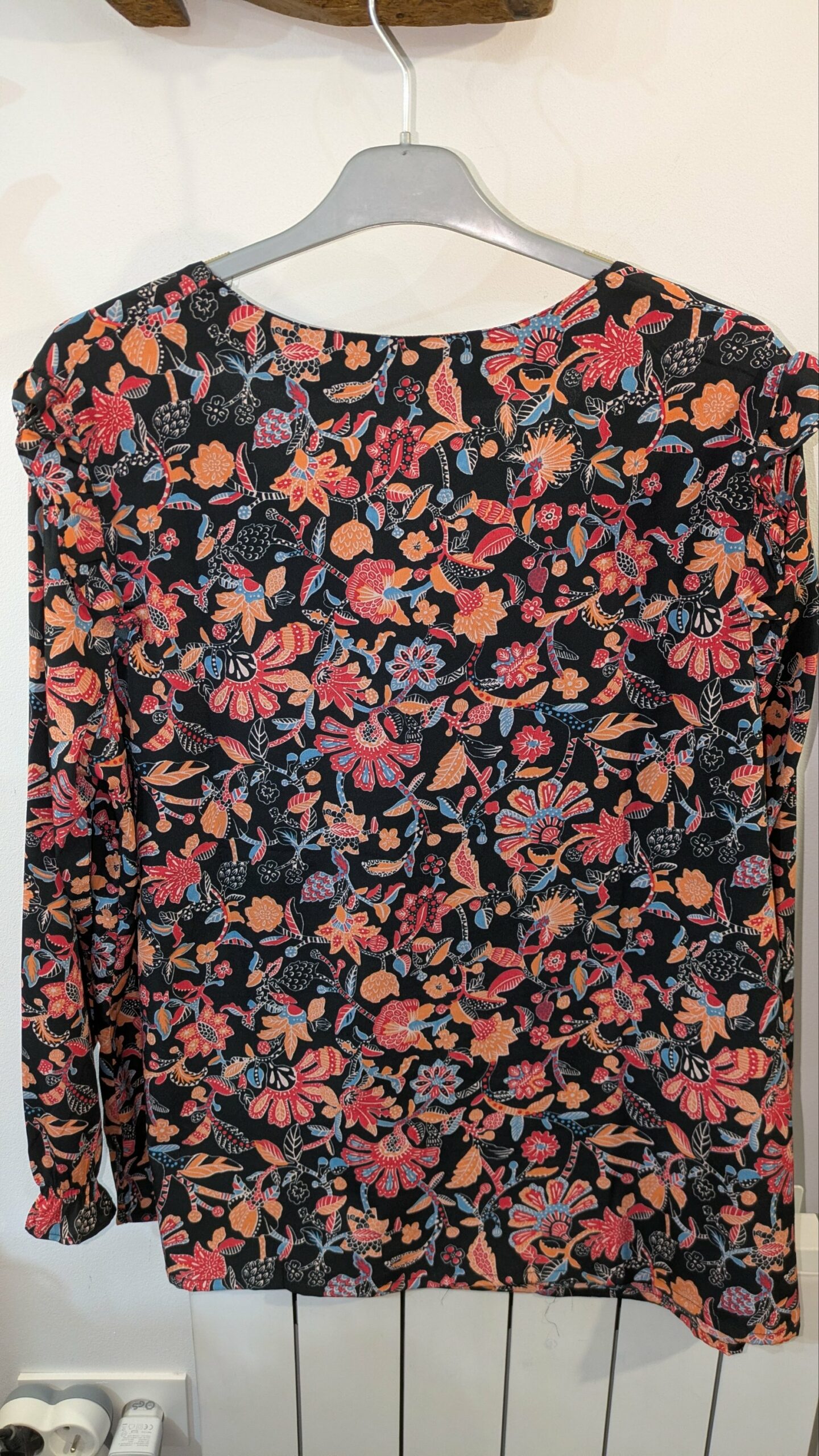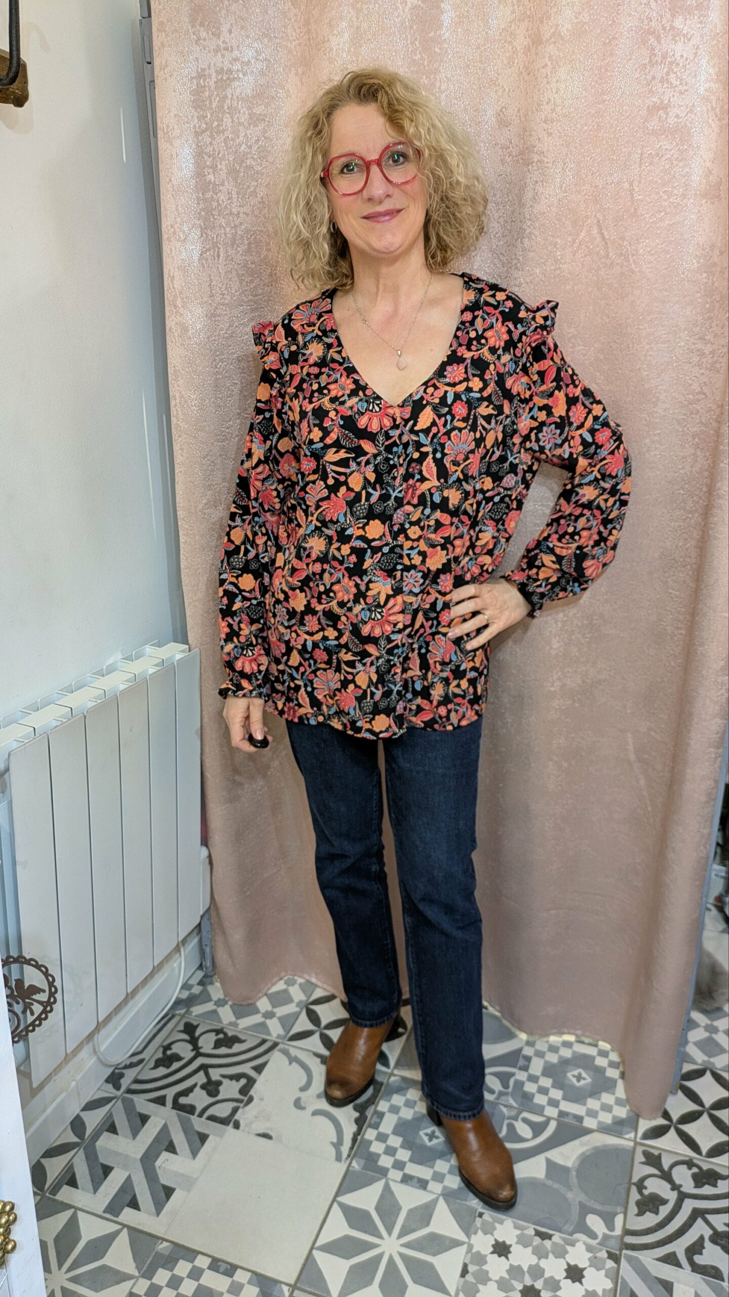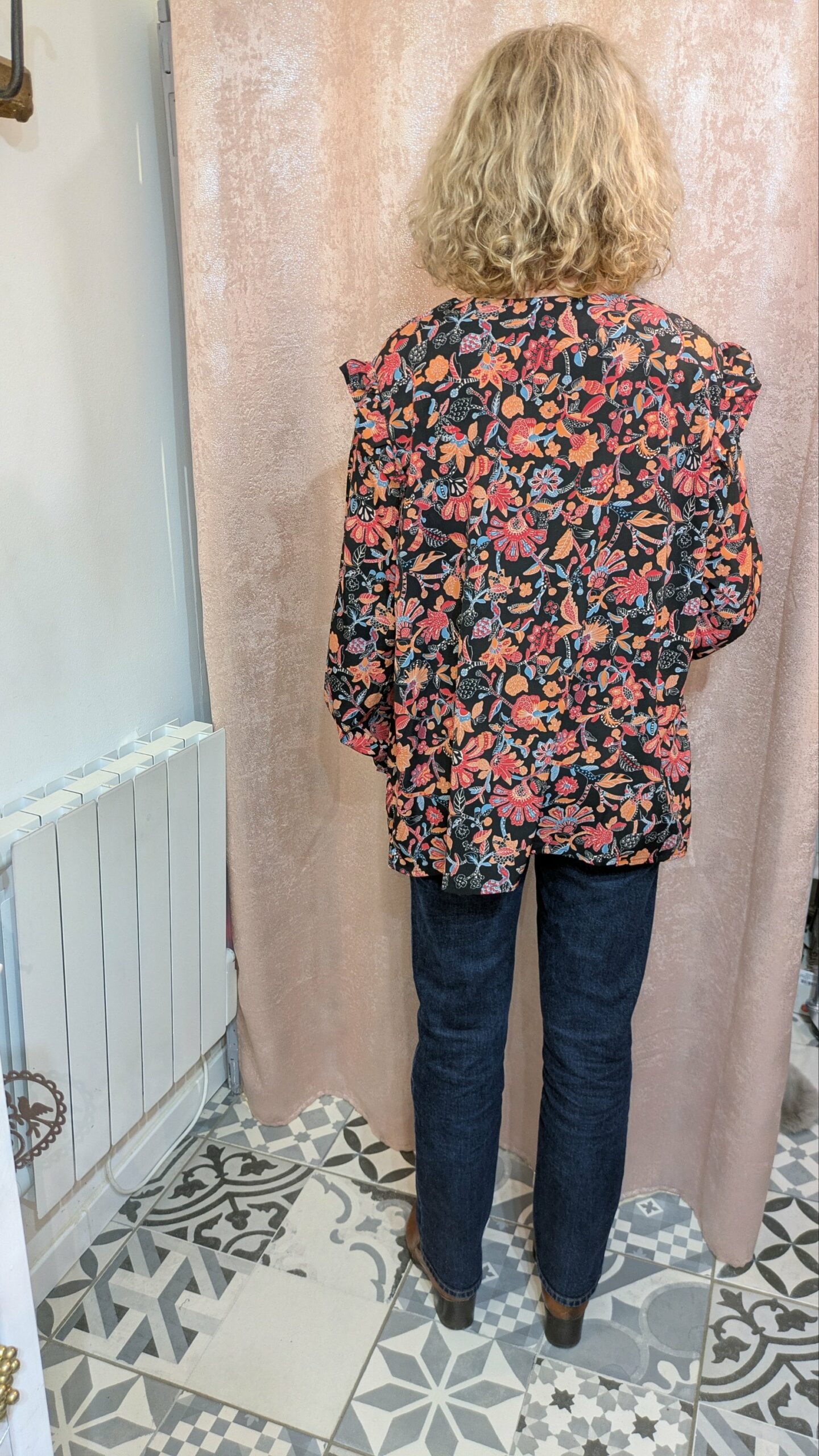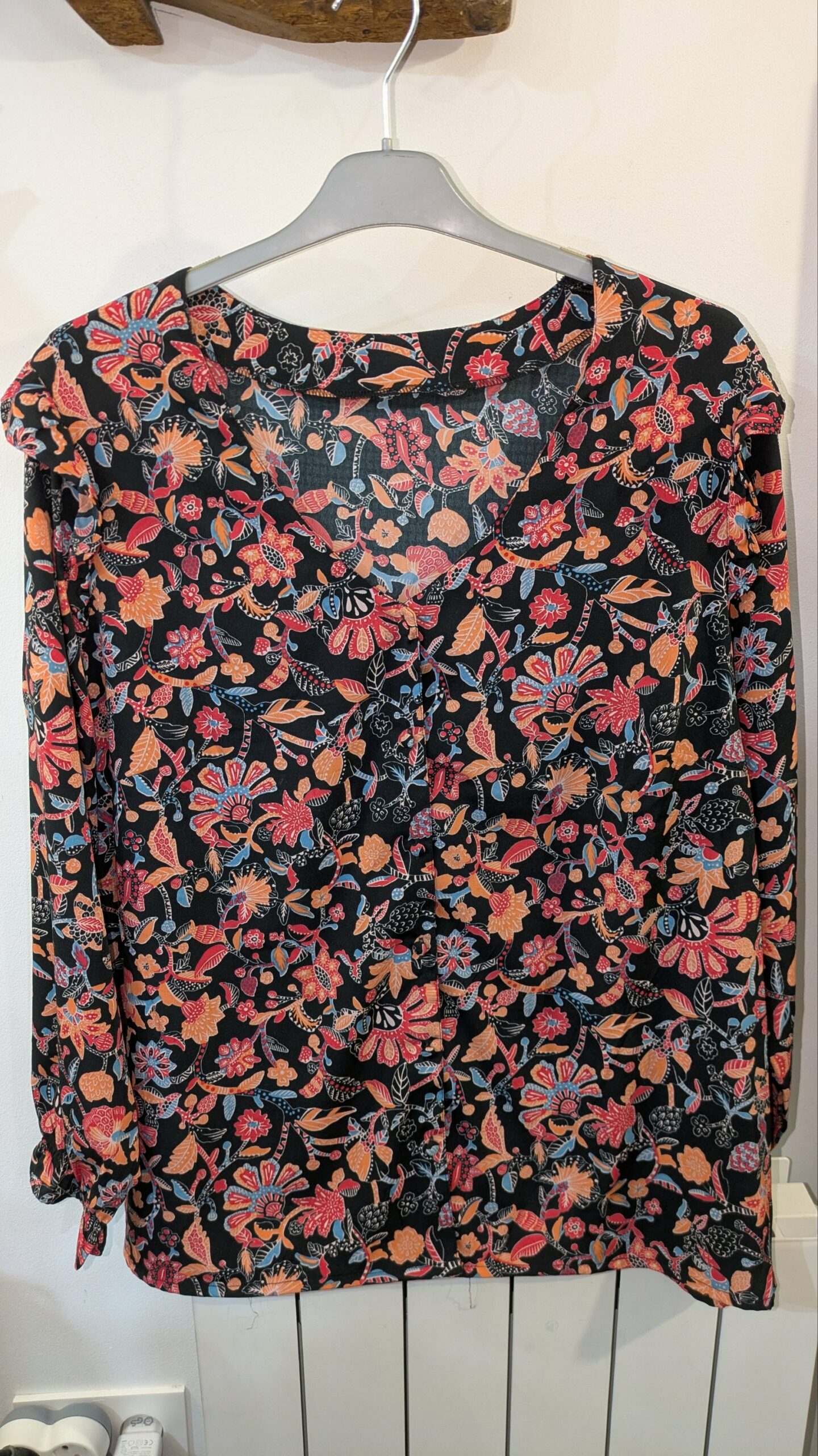 Cette blouse sans marque séduit par ses motifs floraux colorés, mêlant rouge, orange et bleu sur un fond noir profond. Son style bohème est accentué par un petit volant délicat sur chaque épaule et des manches légèrement resserrées, pour un look à la fois romantique et moderne. Parfaite pour les journées ensoleillées ou les soirées décontractées, elle s’associera facilement avec un jean ou une jupe unie.