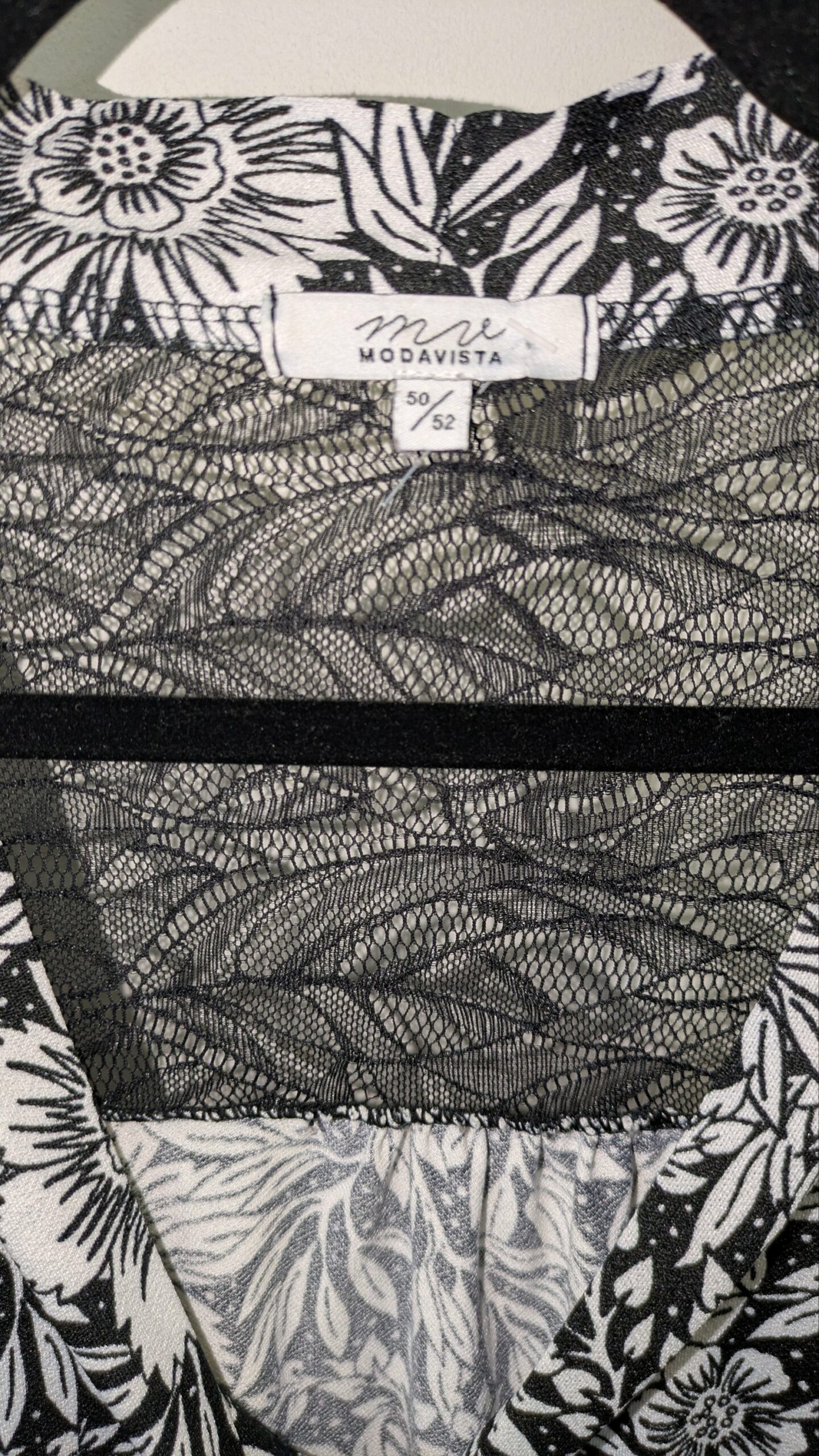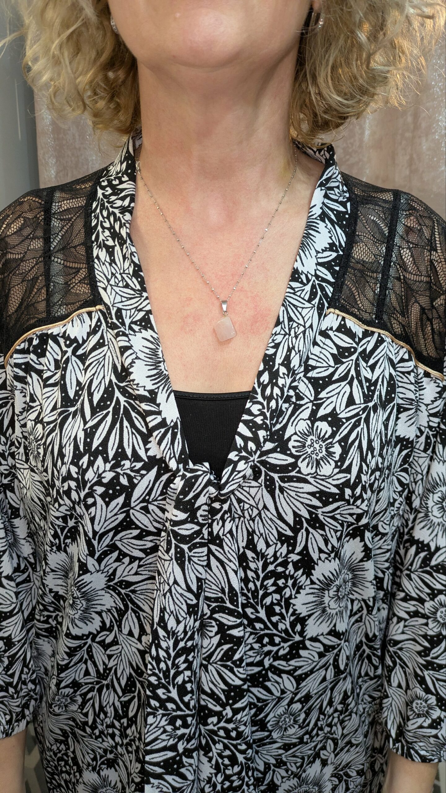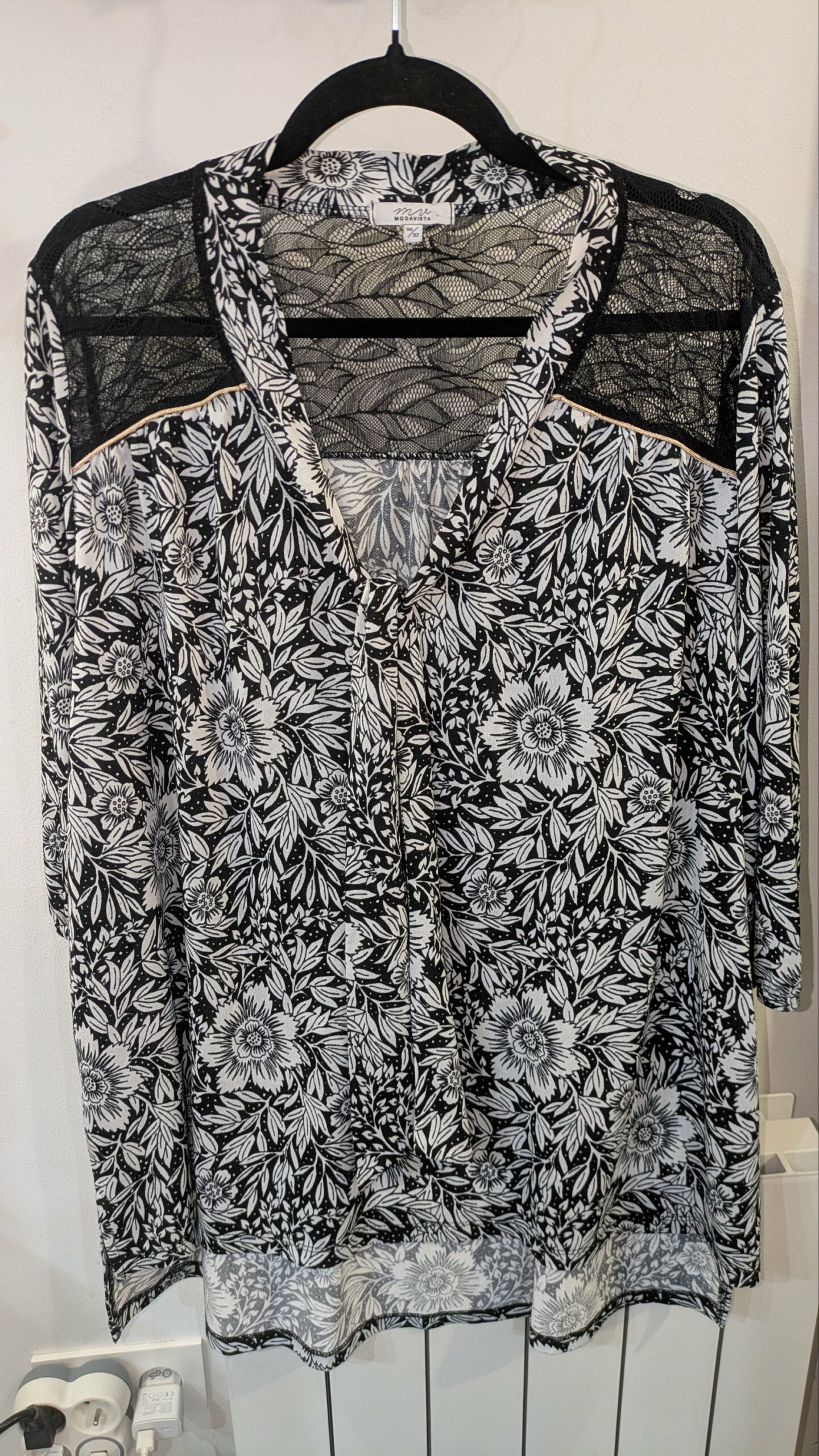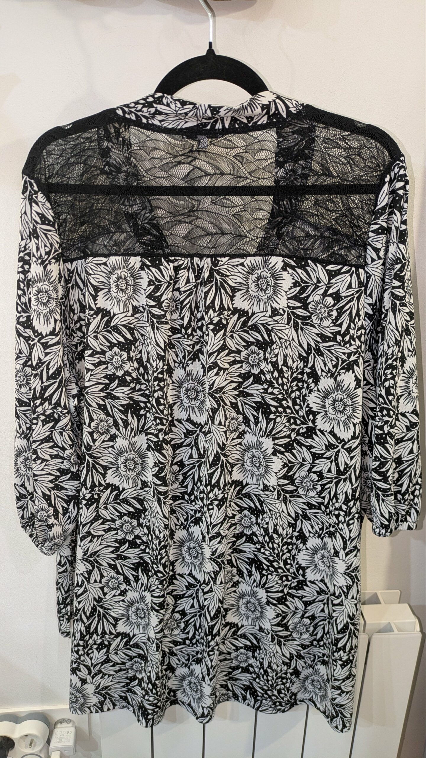 Cette blouse Modavista séduit par son motif floral graphique en noir et blanc, idéal pour un style à la fois chic et décontracté. Les manches trois-quarts et le col cravate ajoutent une touche féminine et élégante, tandis que les inserts en dentelle noire sur le buste apportent une originalité subtile. Parfaite pour le bureau ou une sortie entre amies, cette pièce s’adapte à toutes les occasions.