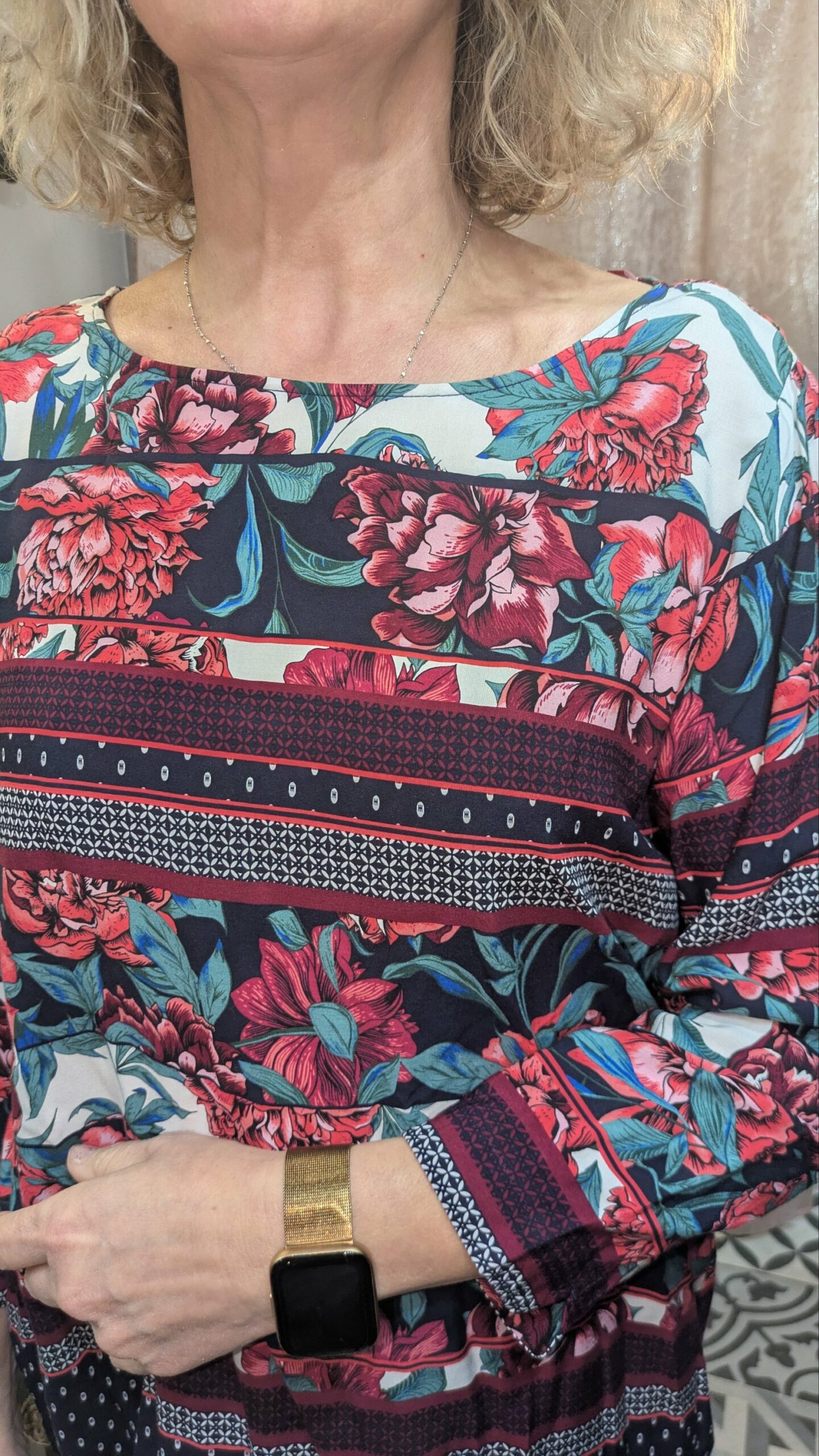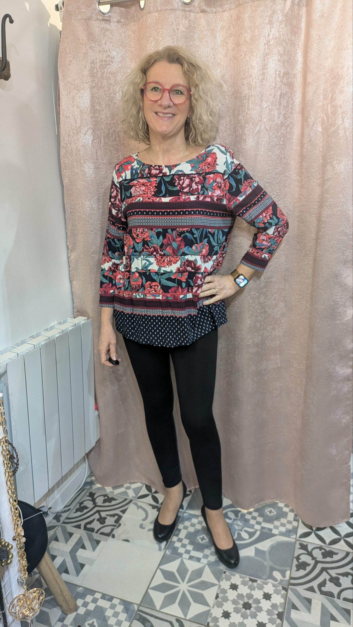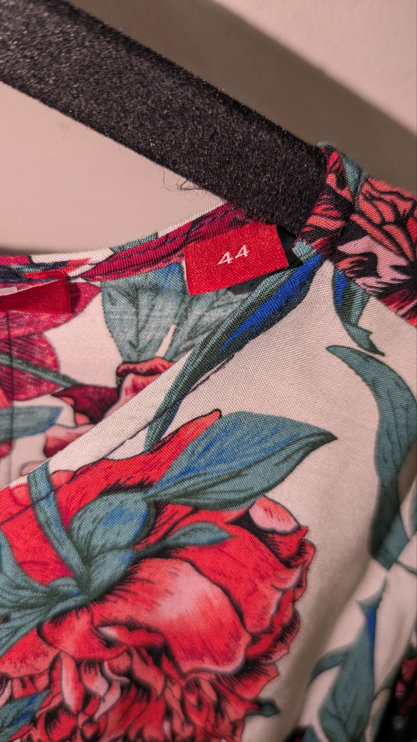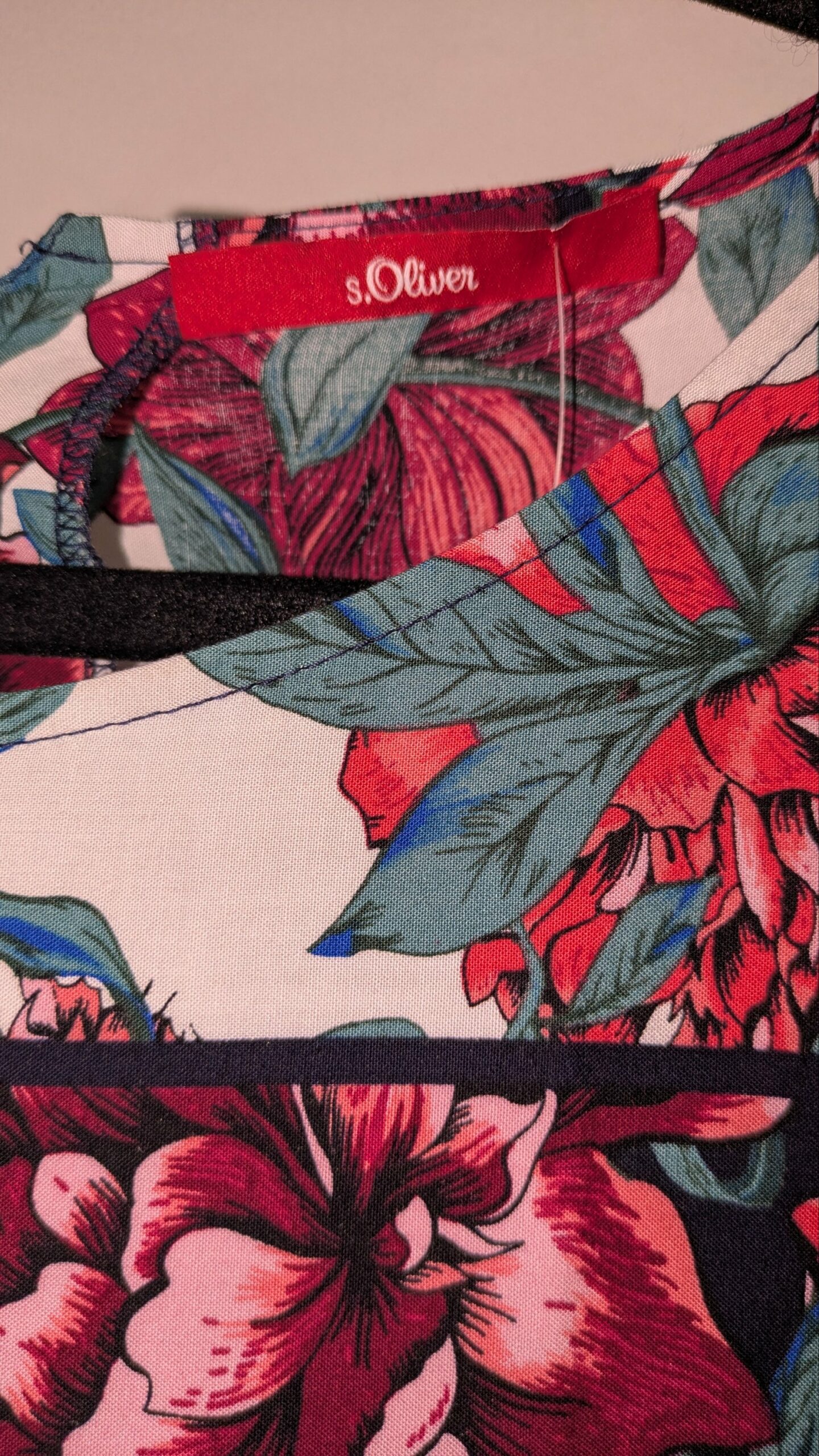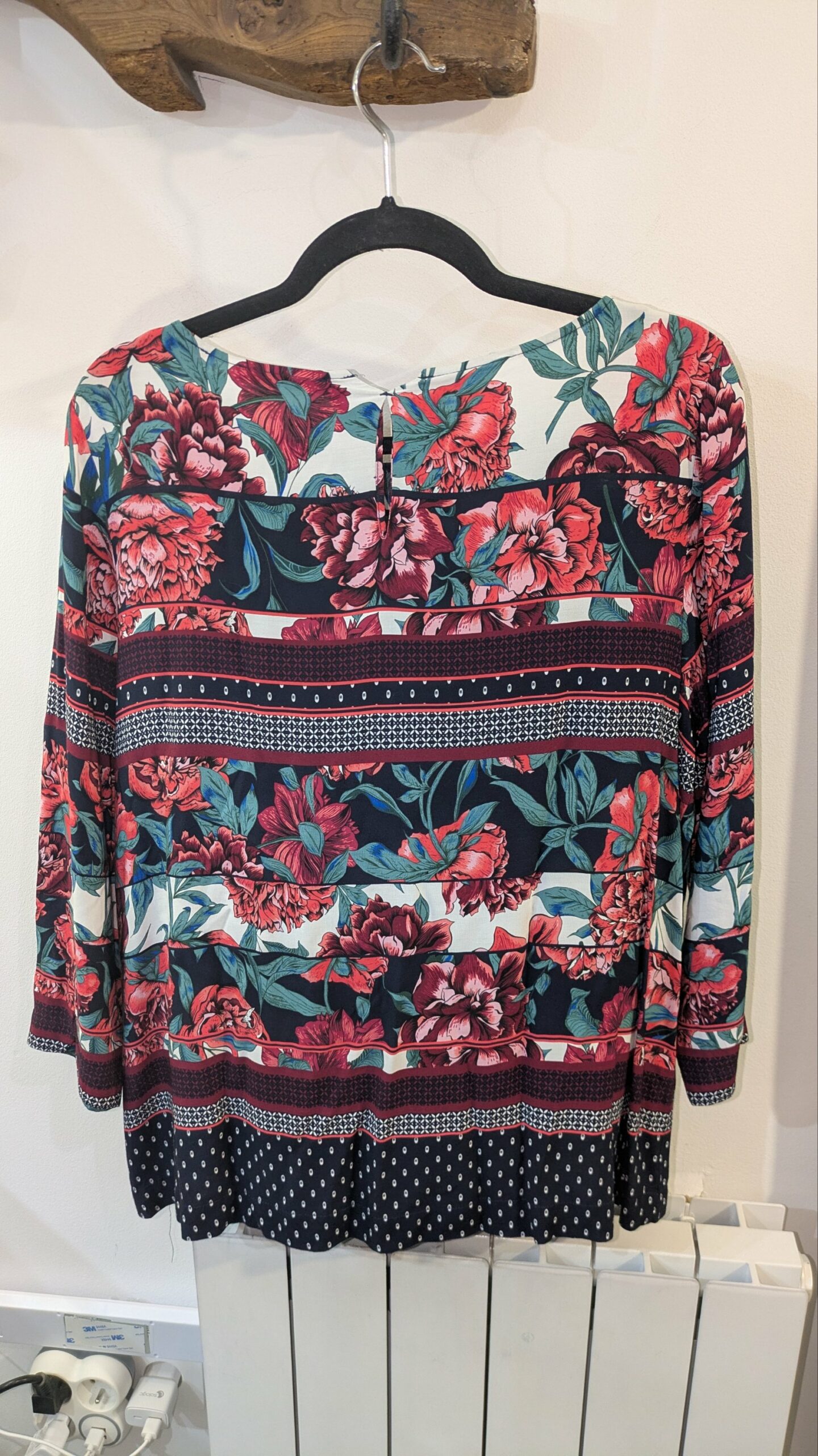 Cette blouse S.Oliver taille 44 séduit par son imprimé floral audacieux, mêlant des fleurs rouges, roses et bleues sur un fond bleu marine. Le tissu en viscose offre une douceur et une fluidité idéales pour un port agréable toute la journée. Les manches longues et la coupe légèrement évasée en font une pièce polyvalente, aussi bien pour le bureau que pour une sortie décontractée.