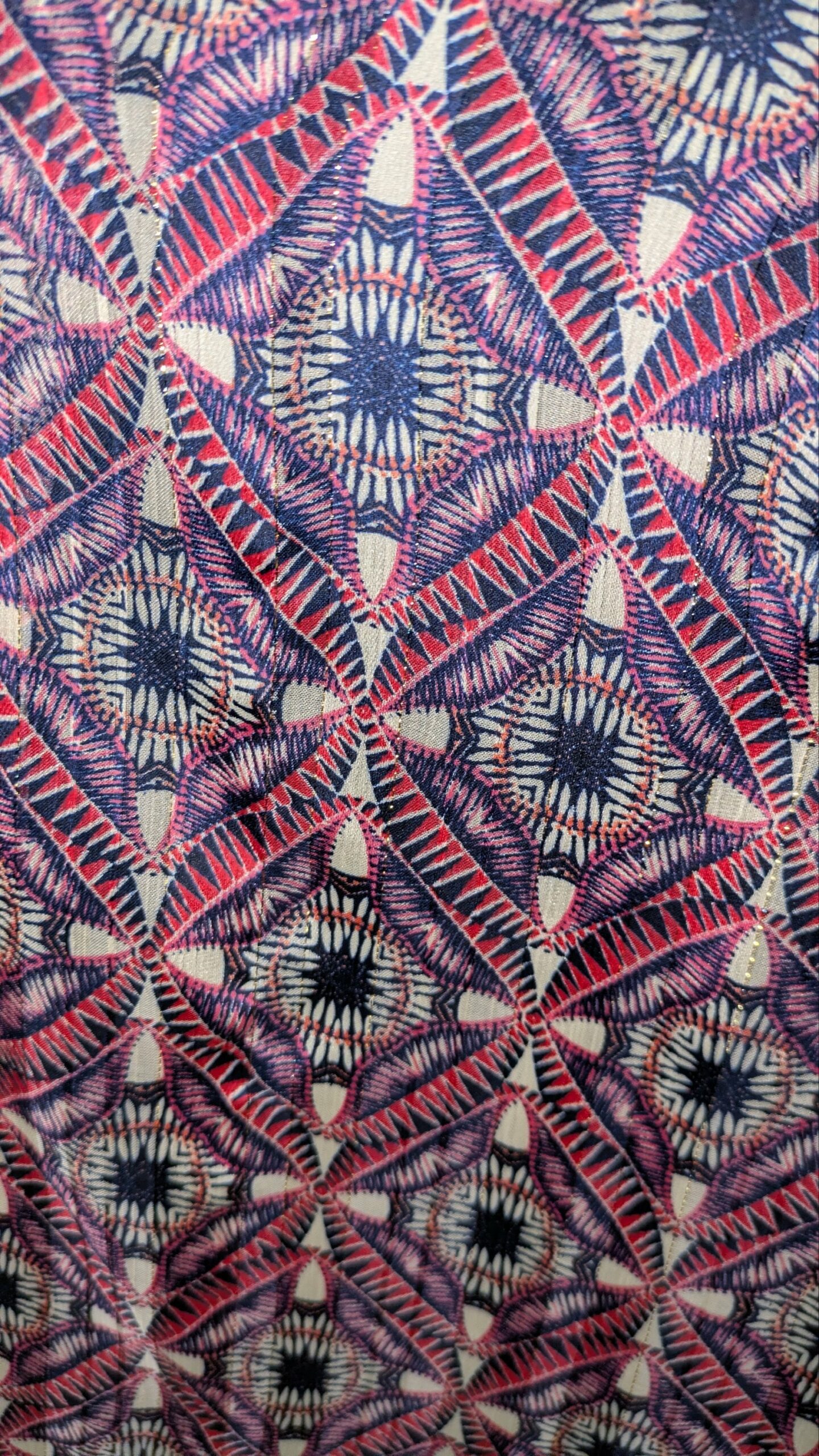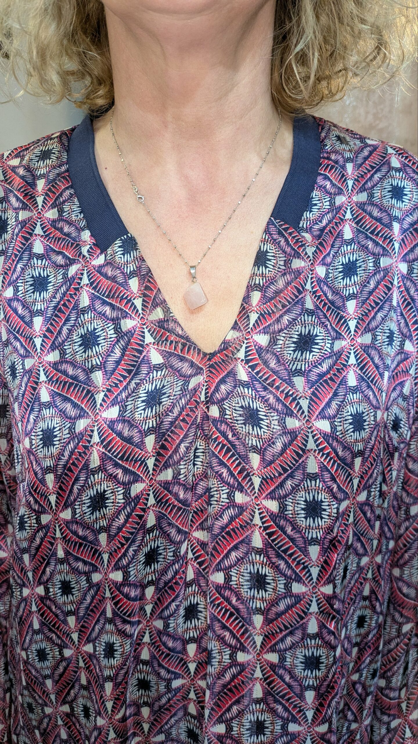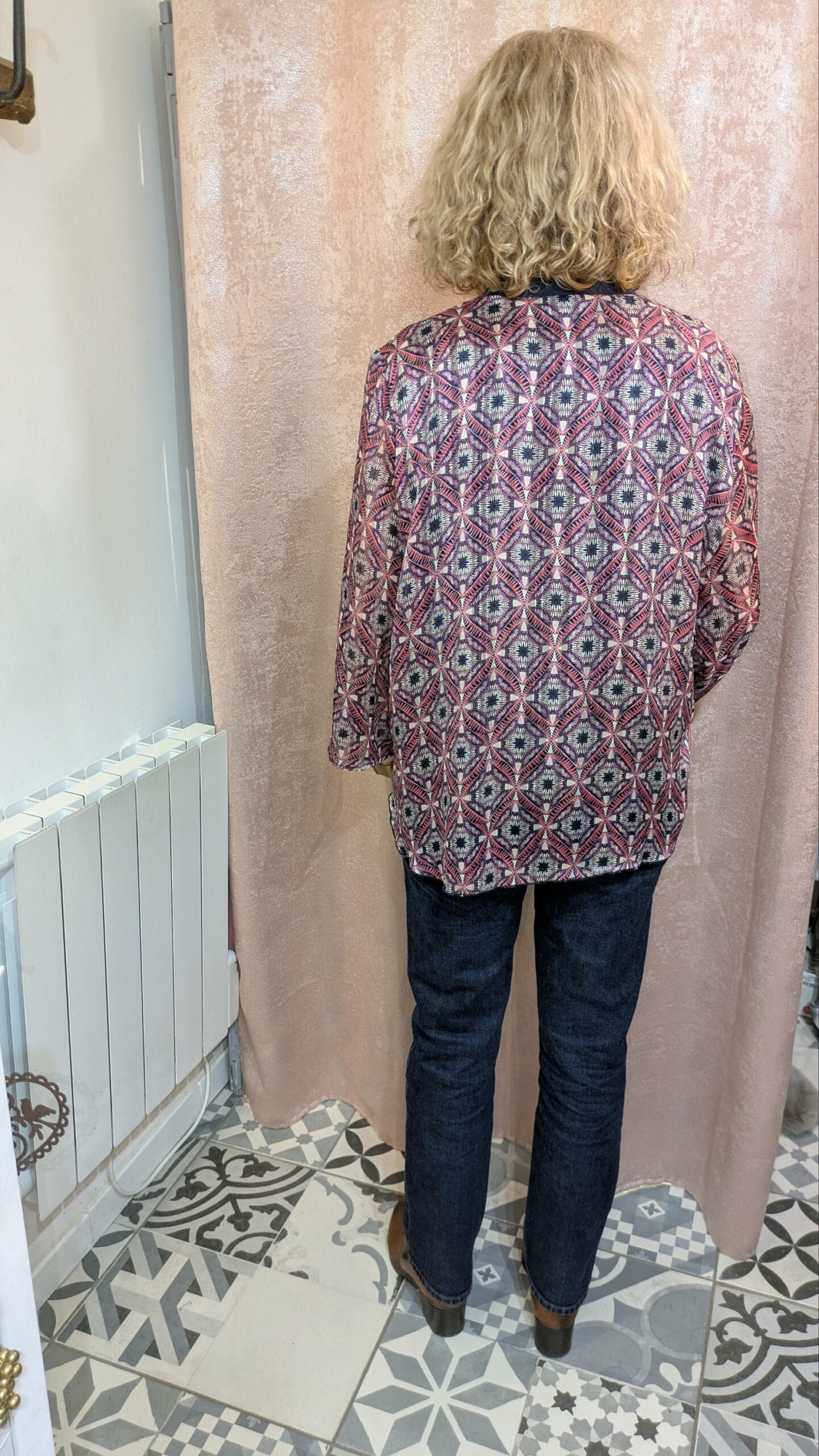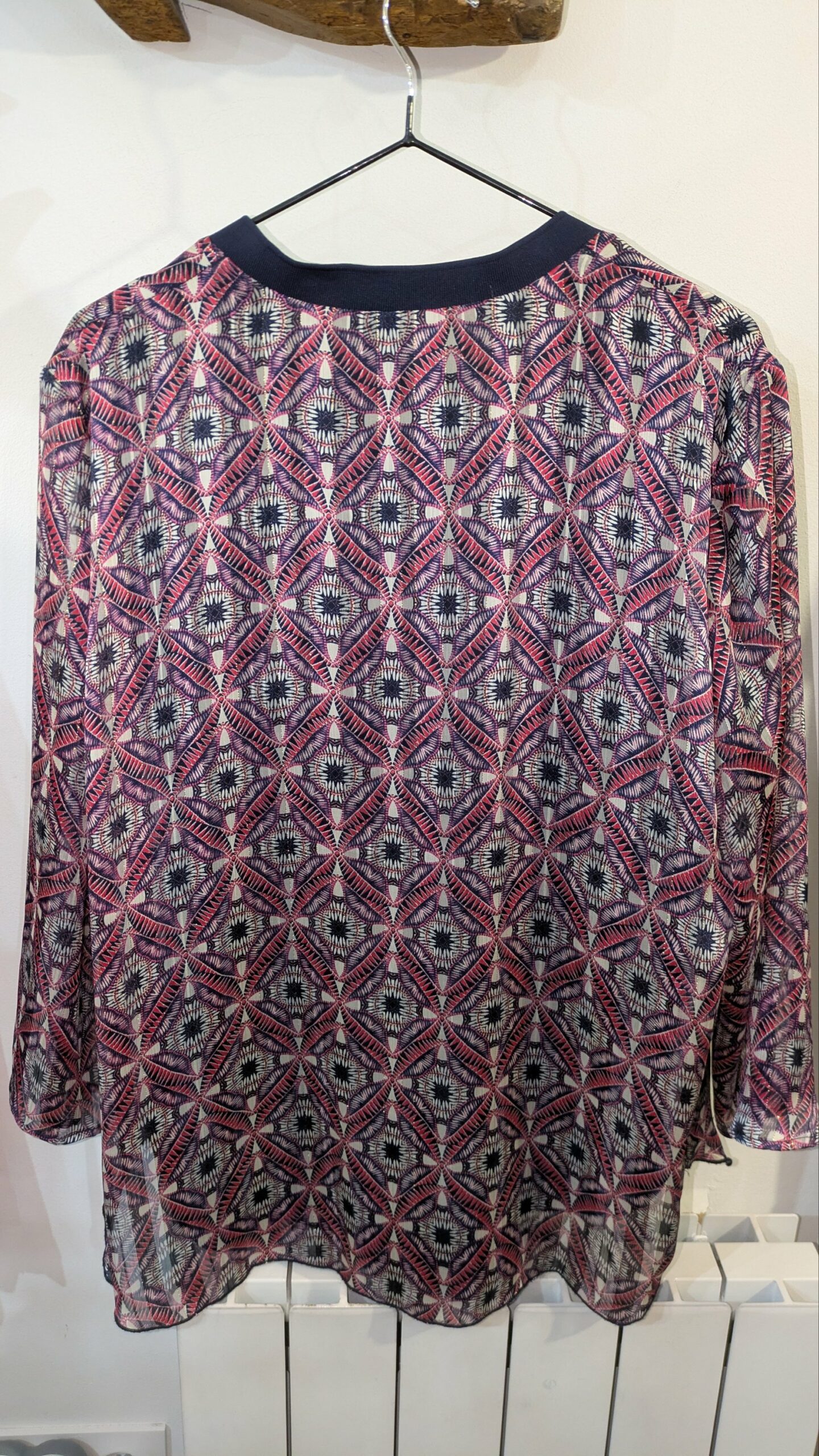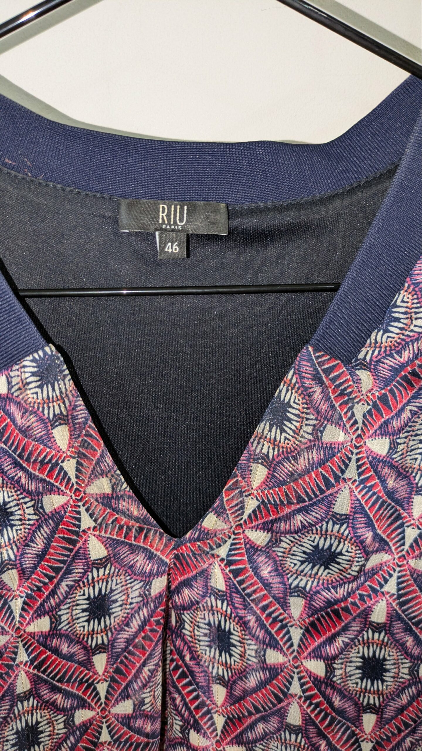 Ce chemisier JACQUELINE RIU Paris se distingue par son motif graphique audacieux, mêlant des tons de rouge, bleu et blanc pour un effet visuel dynamique. Les manches en voile, rehaussées de fils dorés, apportent une touche de légèreté et de sophistication. La coupe est fluide et confortable, idéale pour un look à la fois chic et décontracté.