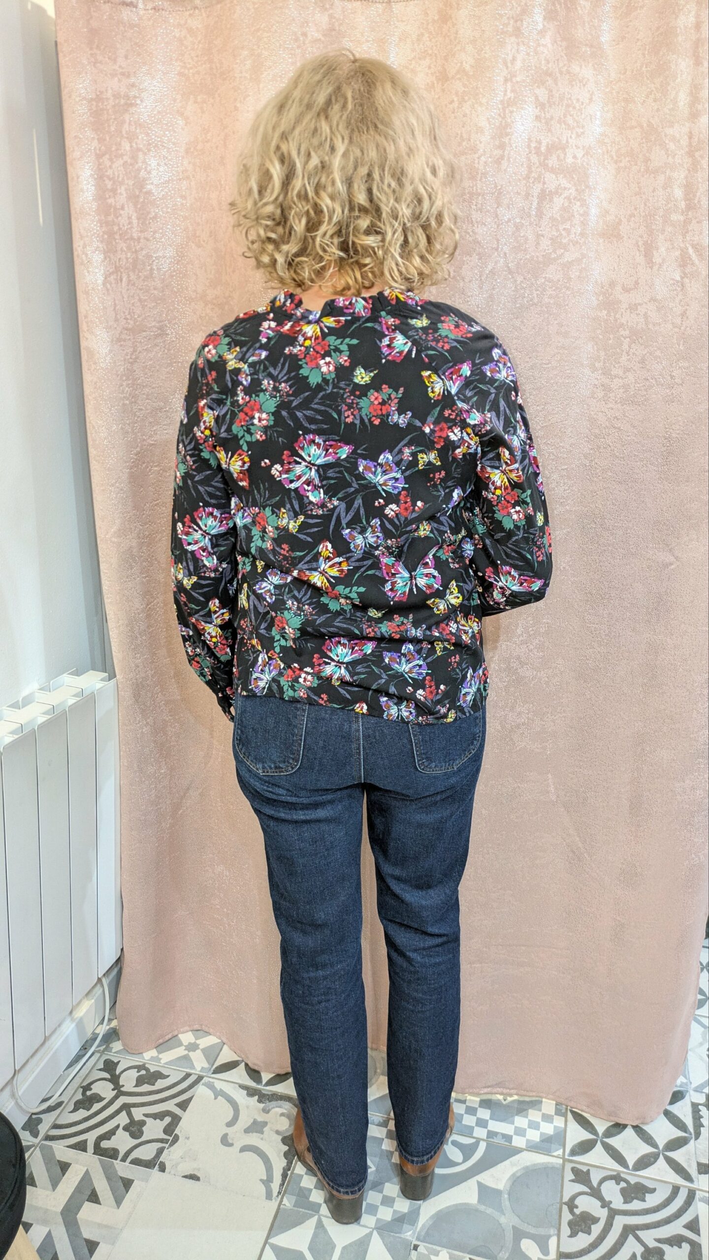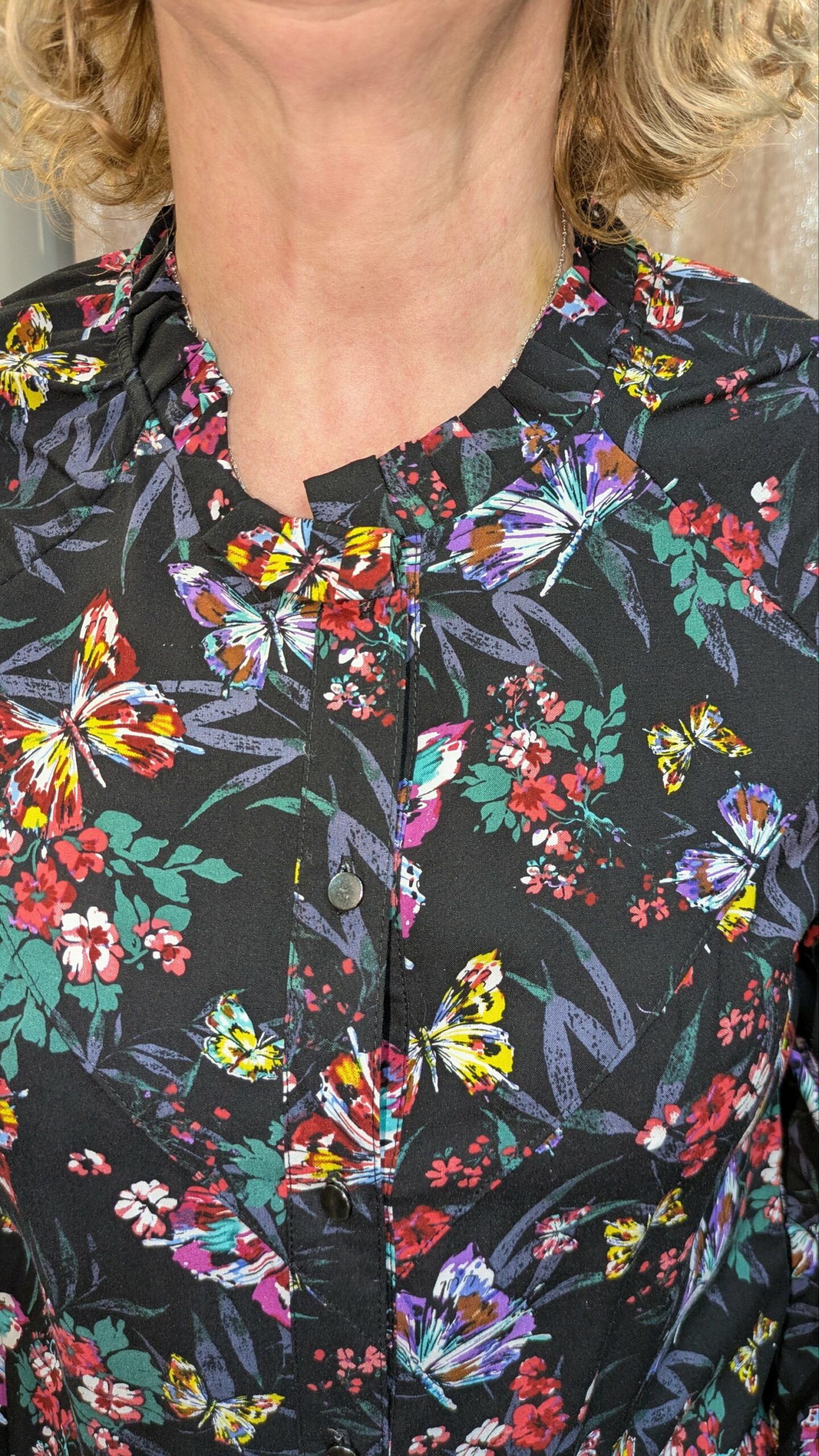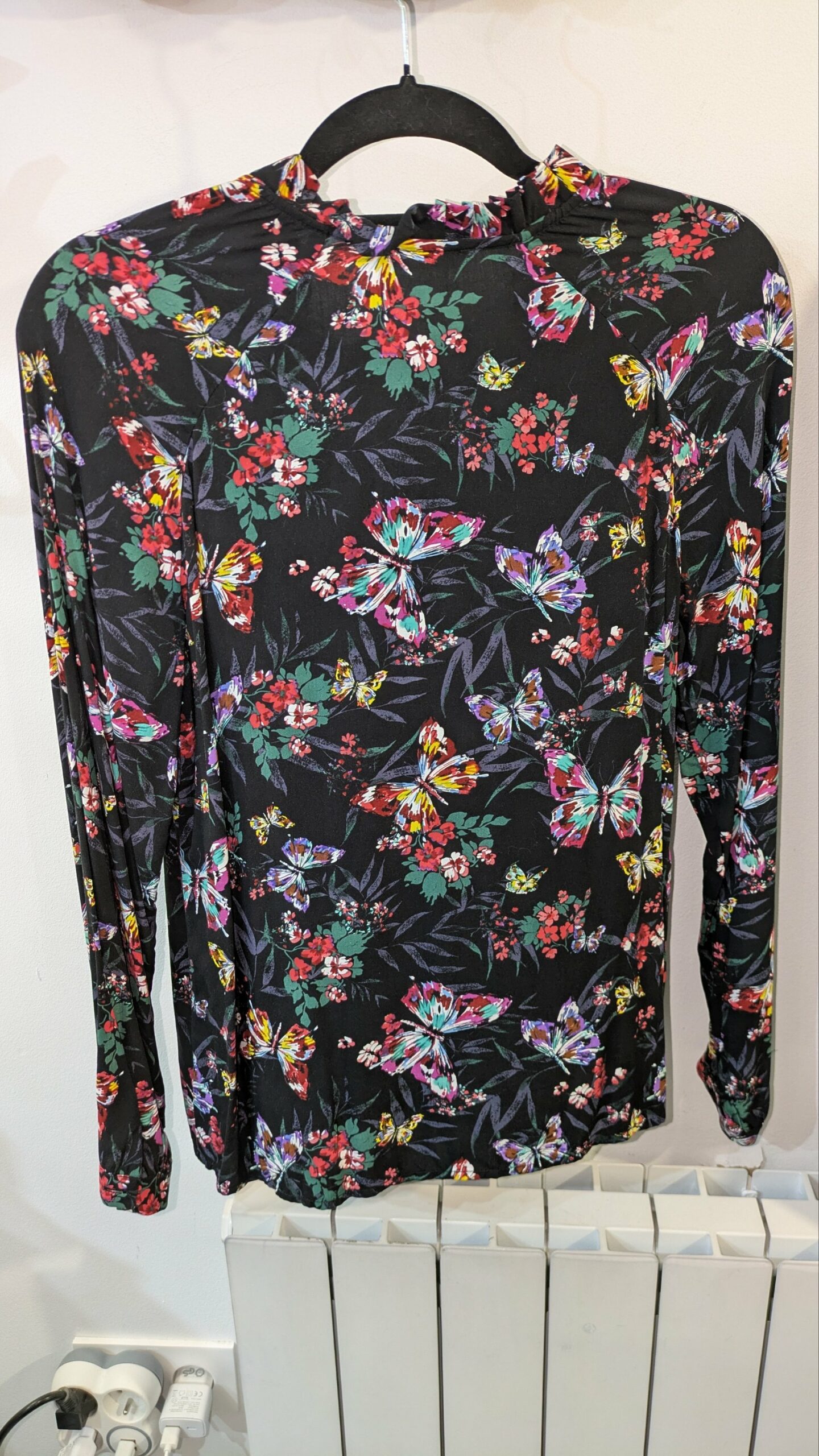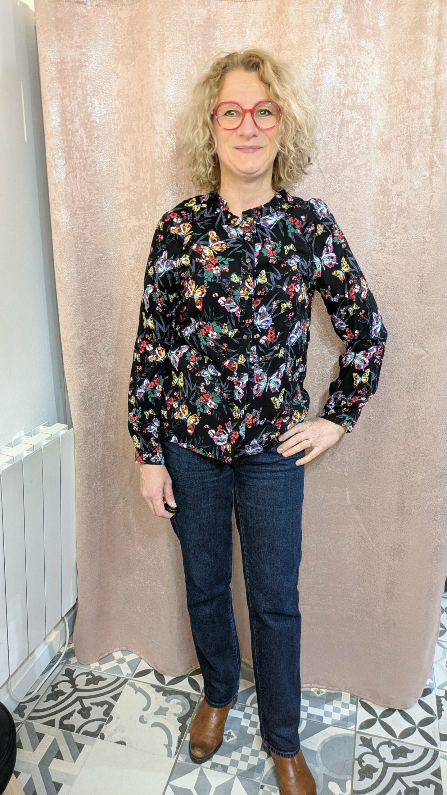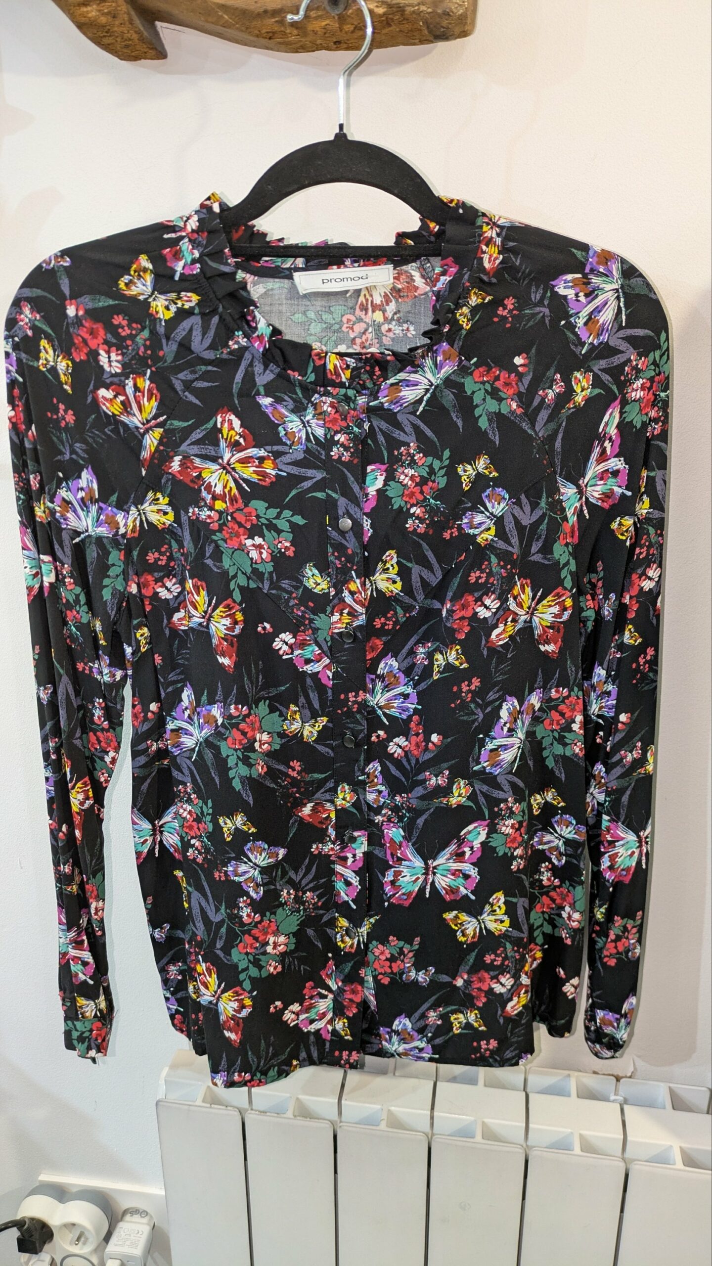 Cette chemise noire de la marque Promod séduit par son imprimé vibrant de papillons et fleurs aux couleurs vives. Les motifs, mêlant rose, vert, bleu et violet, s’animent sur un fond noir pour un effet à la fois romantique et moderne. Les manches longues et la coupe légèrement évasée en font une pièce polyvalente, idéale pour les saisons intermédiaires. Le col rond et les boutons devant ajoutent une touche classique et féminine.
