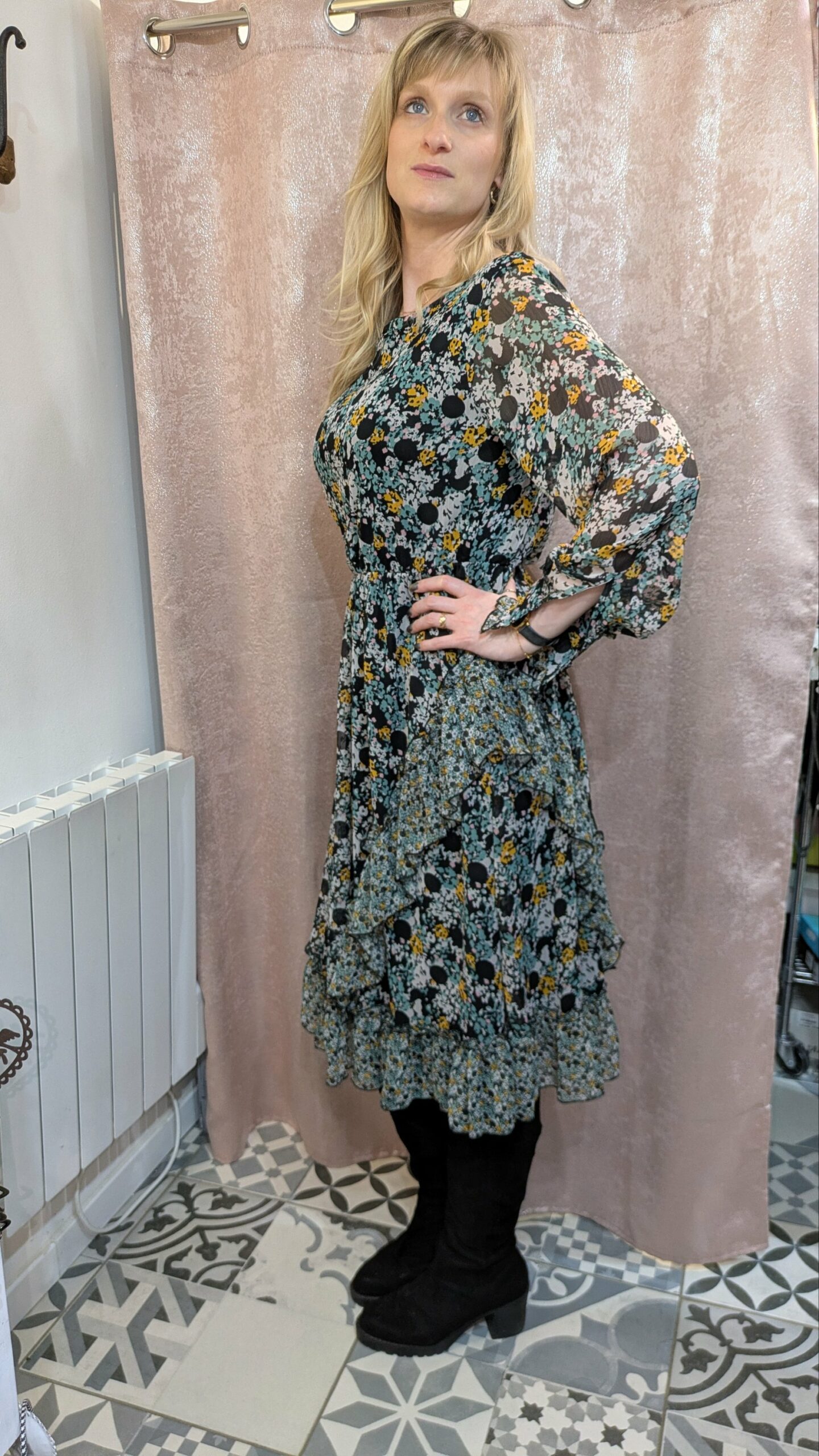 Cette robe longue JDY séduit par son imprimé floral audacieux, mêlant des touches de jaune, rose et vert sur un fond noir. Les manches voile, légères et aériennes, apportent une touche romantique, tandis que la coupe fluide et évasée met en valeur la silhouette. Idéale pour les soirées, mariages ou événements élégants, cette robe allie confort et style avec une matière en polyester douce et fluide.