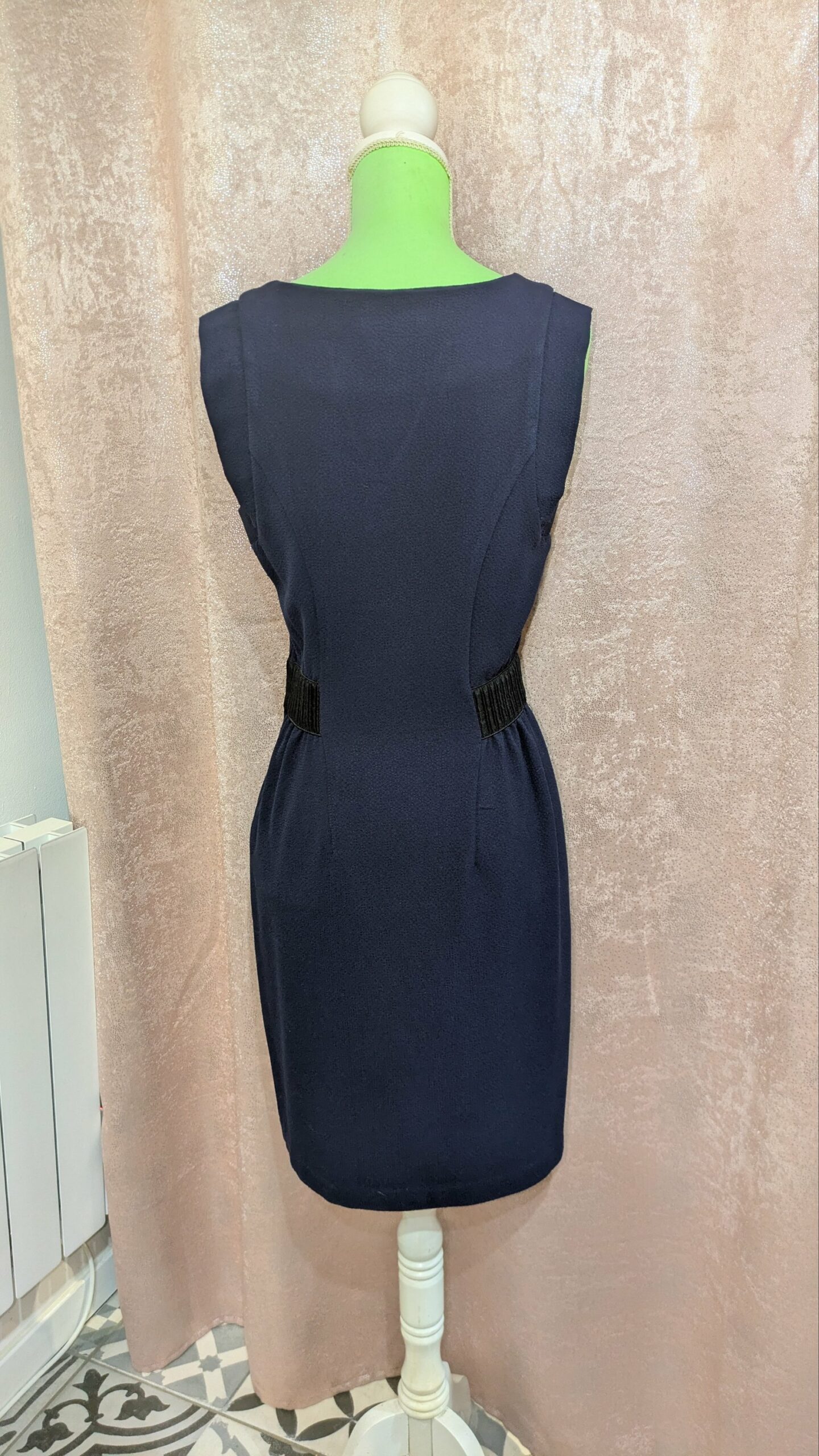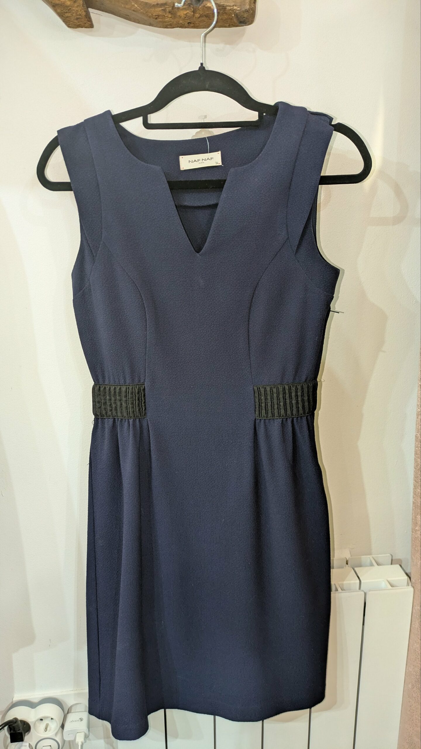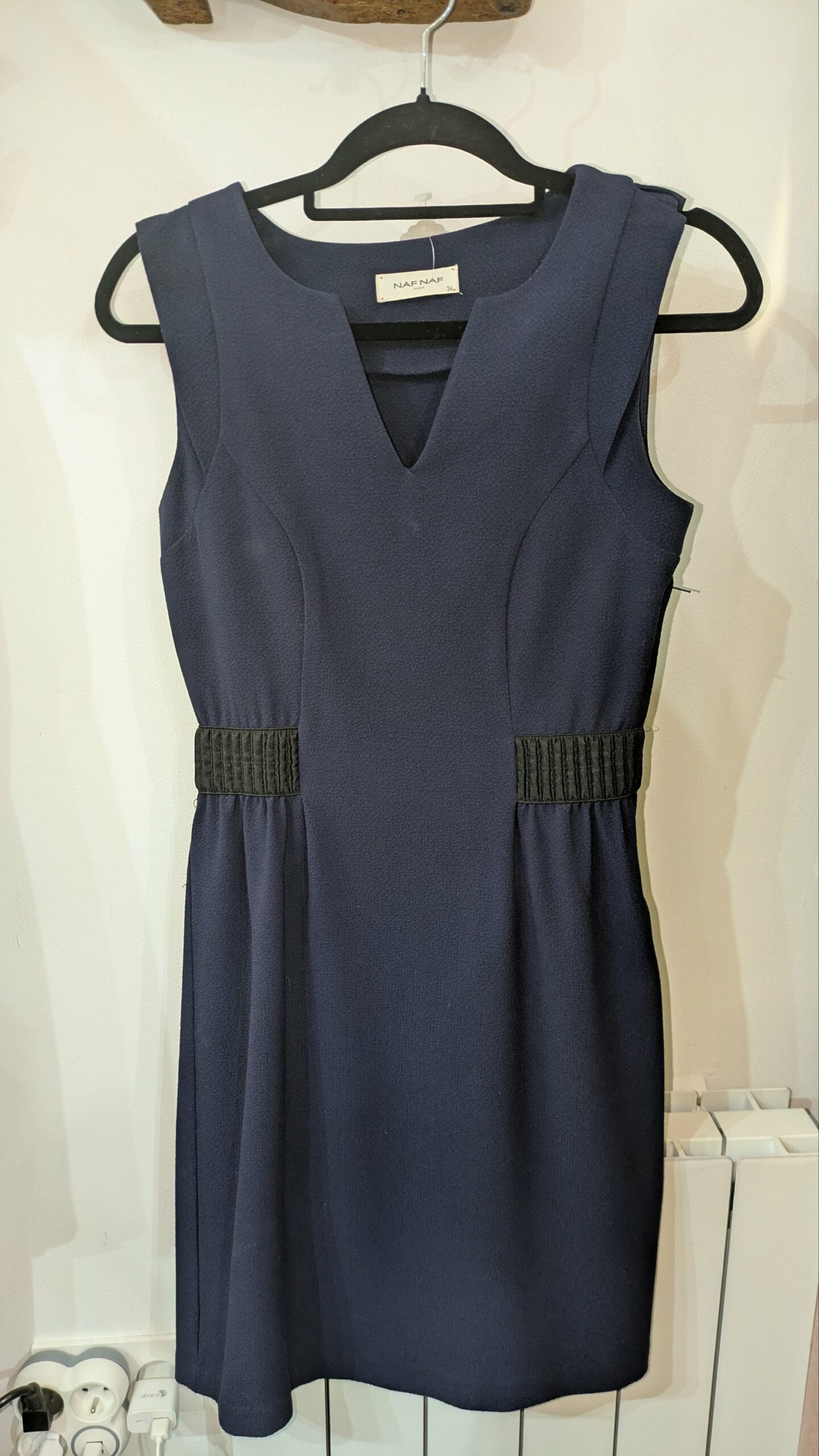 Cette robe Naf Naf, en marine et noir, séduit par son élégance sobre et sa coupe structurée. La partie supérieure marine, , se marie parfaitement avec la ceinture en tissu noir qui souligne la taille. La apporte une touche féminine et fluide, idéale pour les occasions habillées ou un .