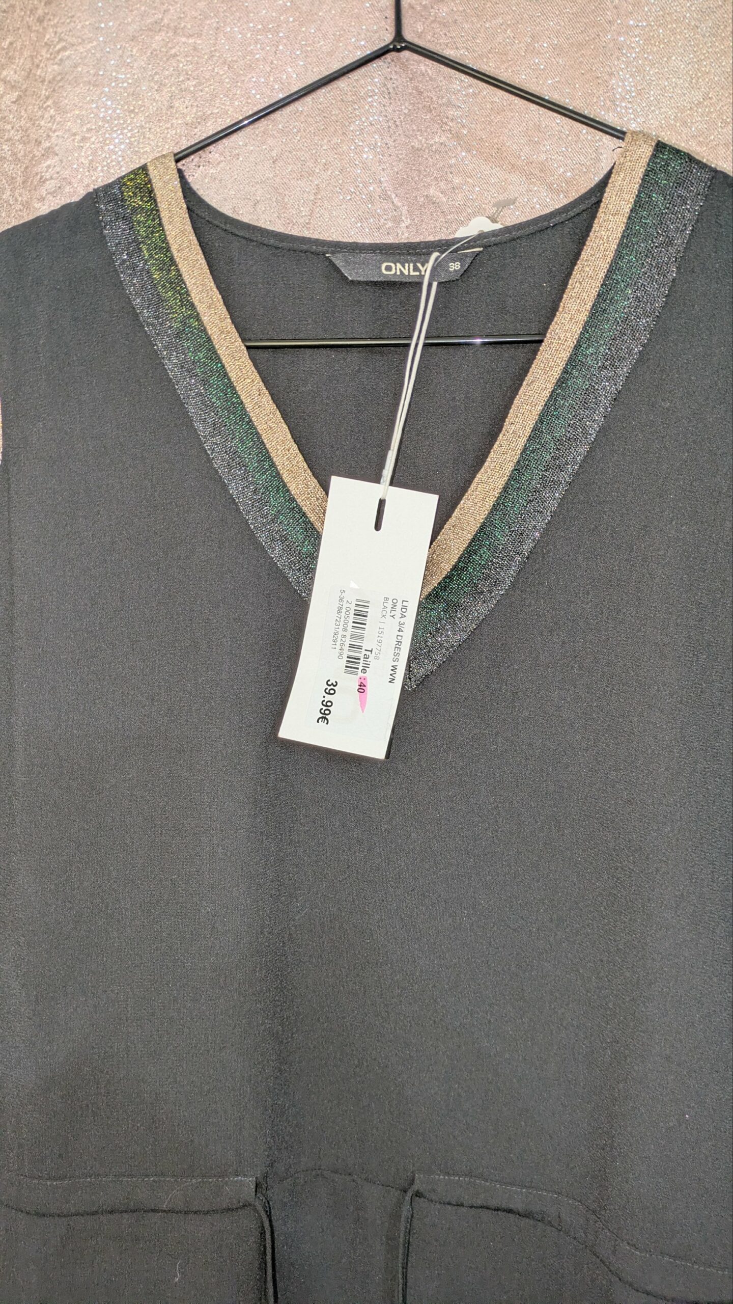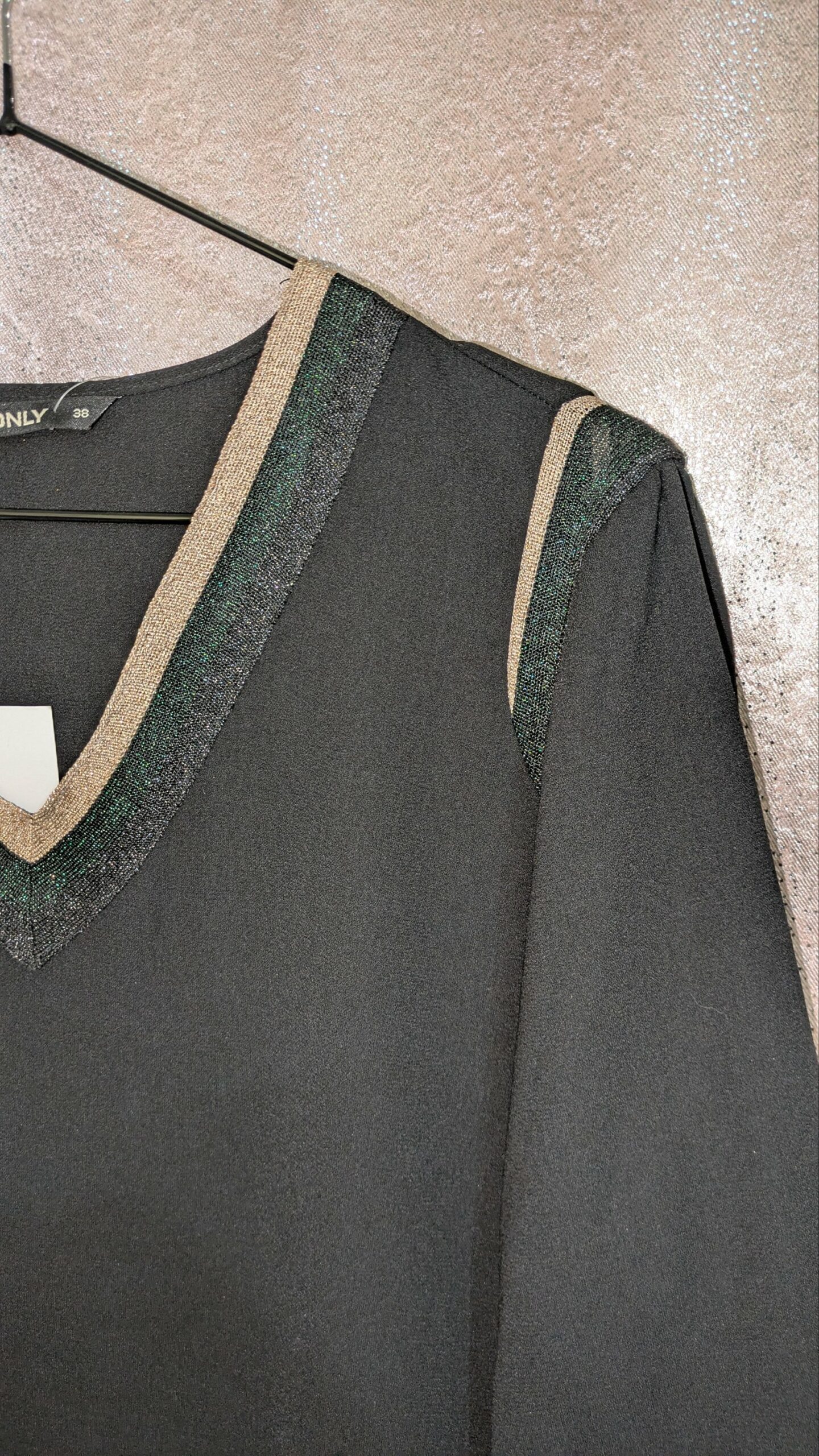 Cette robe longue noire de la marque ONLY séduit par son style sobre et raffiné. Les finitions scintillantes sur le col en V et les poignets apportent une touche de glamour, tandis que la coupe fluide et légère met en valeur la silhouette. Parfaite pour les soirées ou les occasions spéciales, elle se distingue par son élégance intemporelle et son fendu discret sur les côtés.