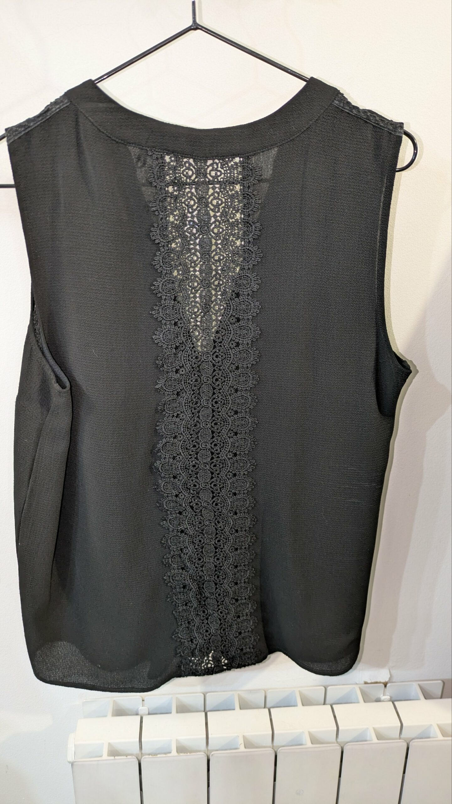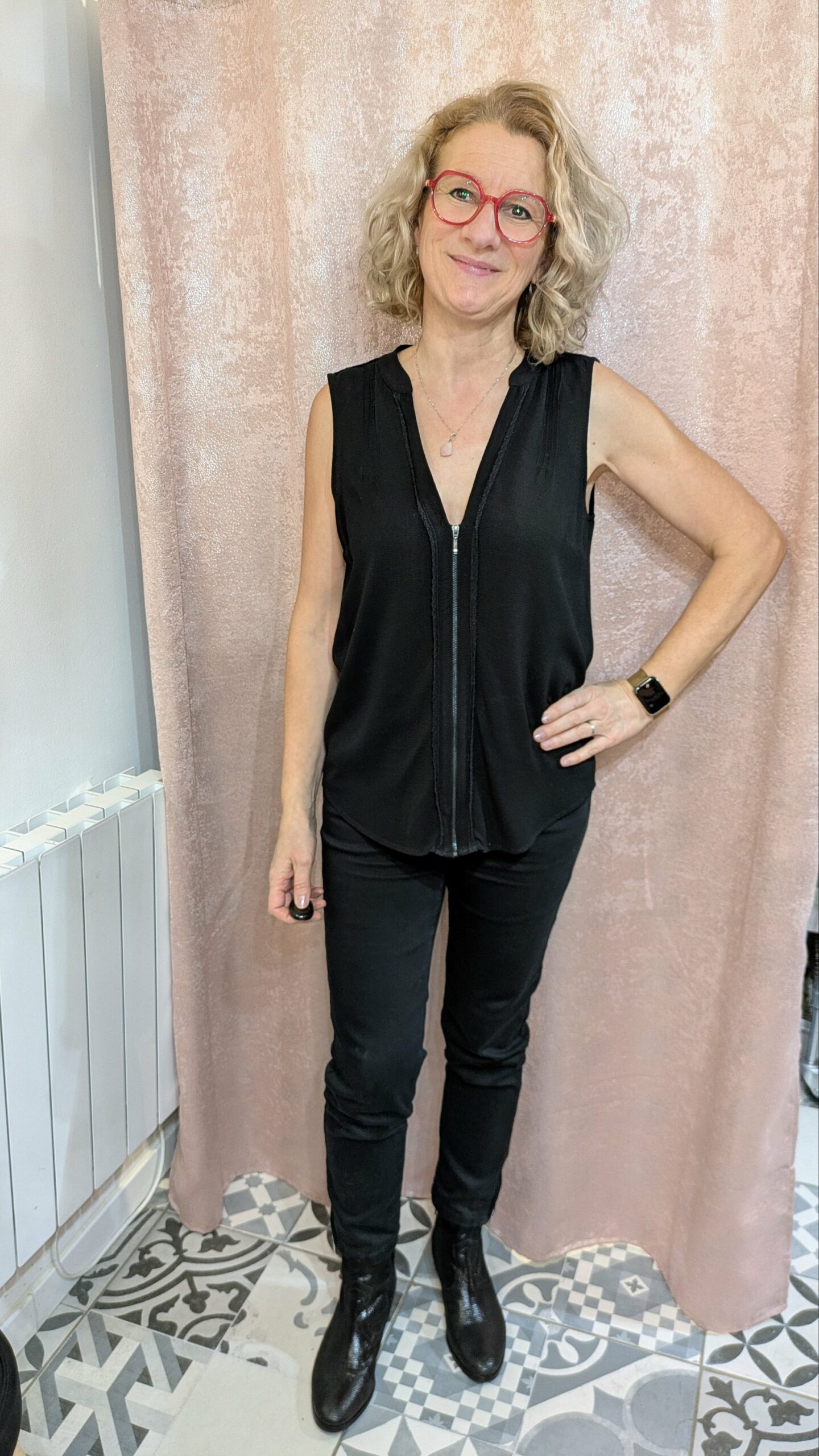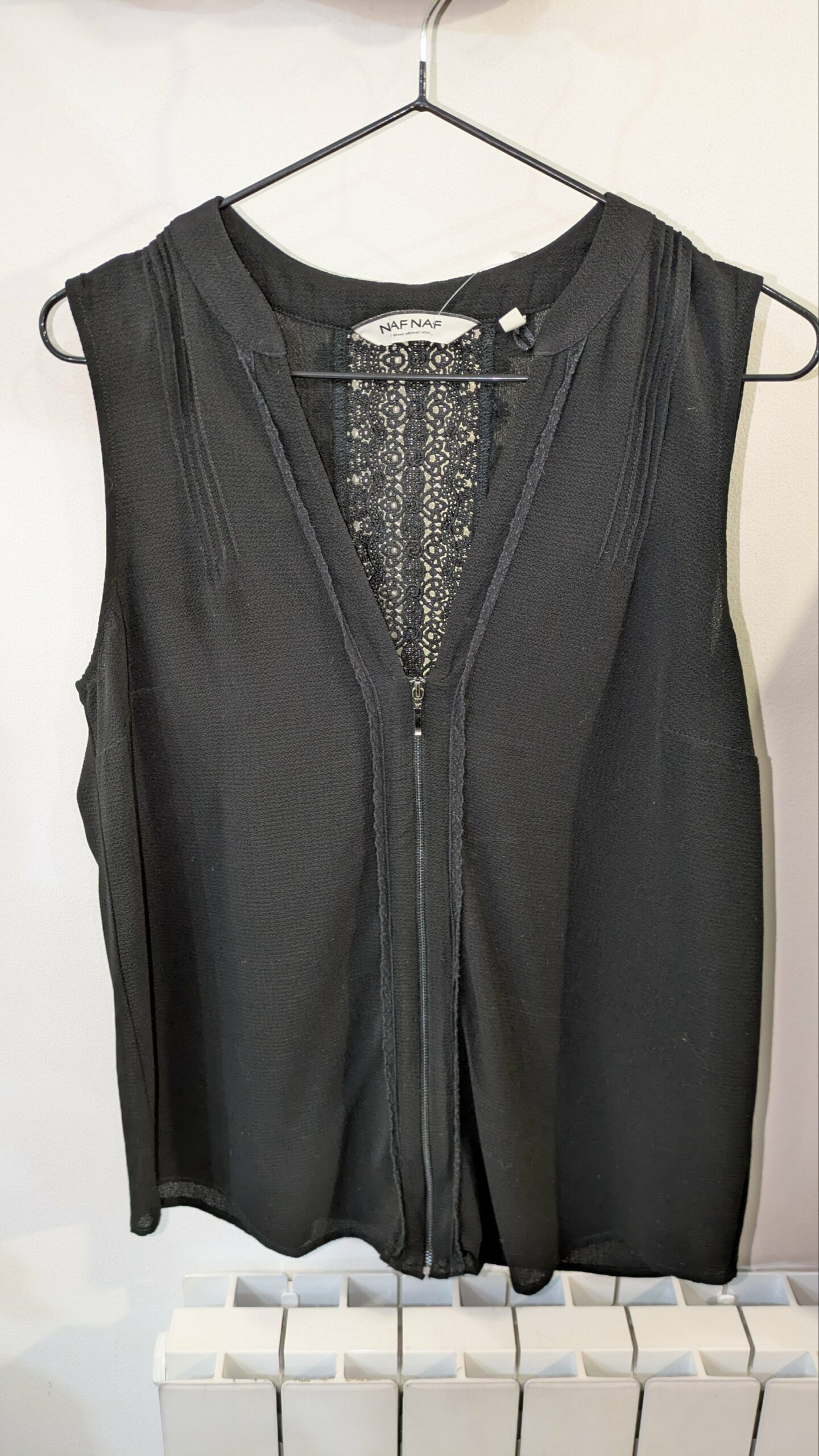 Ce top noir sans manches Naf Naf séduit par son élégance sobre et son détail de dentelle sur le buste. Parfai pour les soirées ou les événements habillés, il met en valeur une silhouette féminine grâce à sa coupe droite et son zip avant pratique. La matière en polyester offre un tombant fluide et confortable.